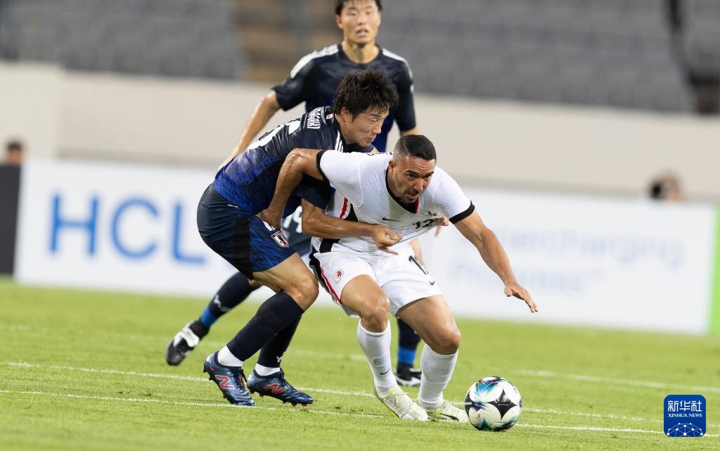 7月8日,中國香港隊球員艾華(前)與日本隊球員古賀太陽在比賽中拼搶。新華社發(全休相攝)
