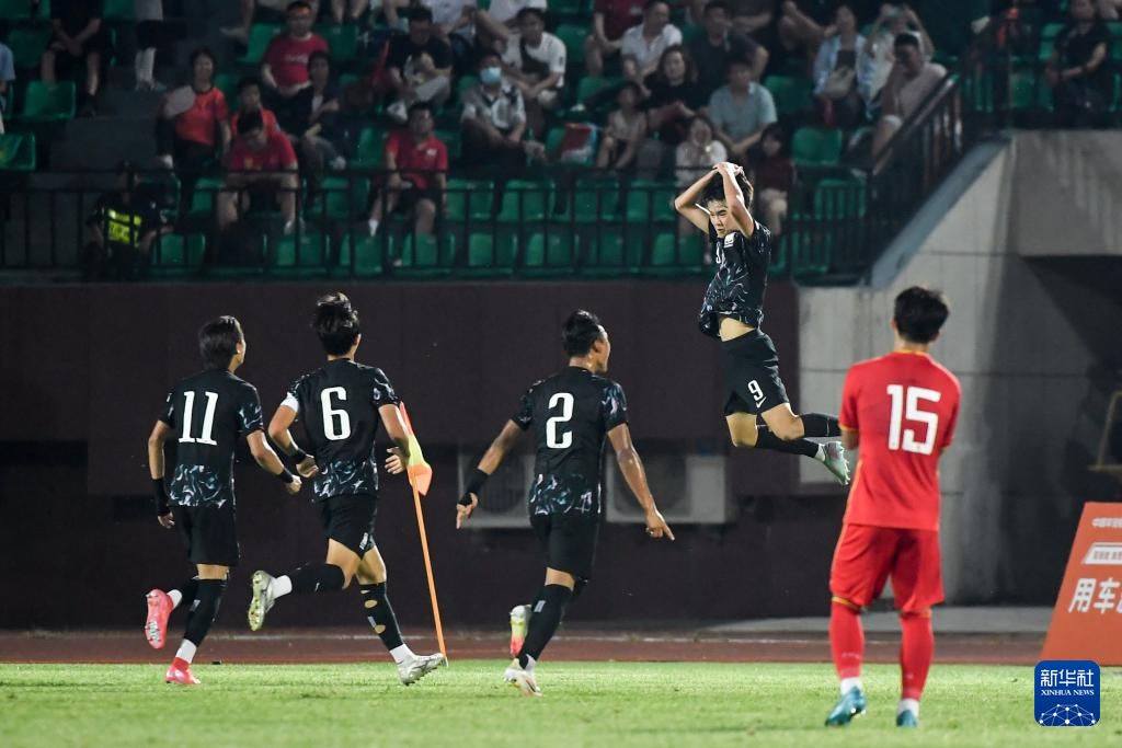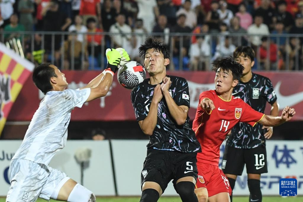 7月8日,韓國(guó)隊(duì)球員金志浩(右一)在比賽中射門(mén)得分。新華社記者 潘昱龍 攝