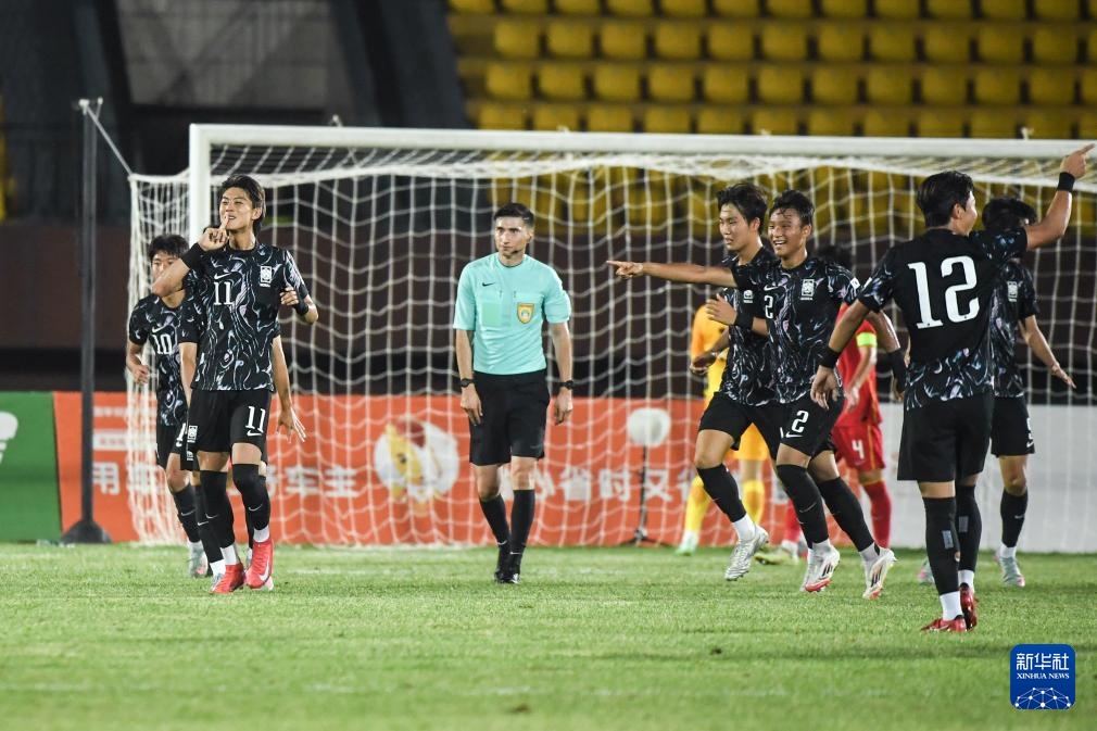 7月8日,韓國(guó)隊(duì)球員金志浩(左二)在進(jìn)球后慶祝。新華社記者 潘昱龍 攝
