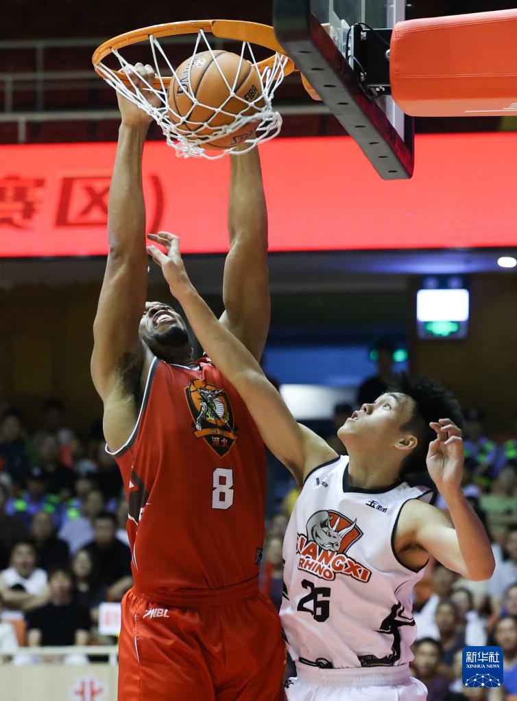 7月8日,石家莊翔藍隊球員沃倫(前左)與廣西威壯隊球員彰中非(前右)在比賽中拼搶。新華社發(張曉峰攝)