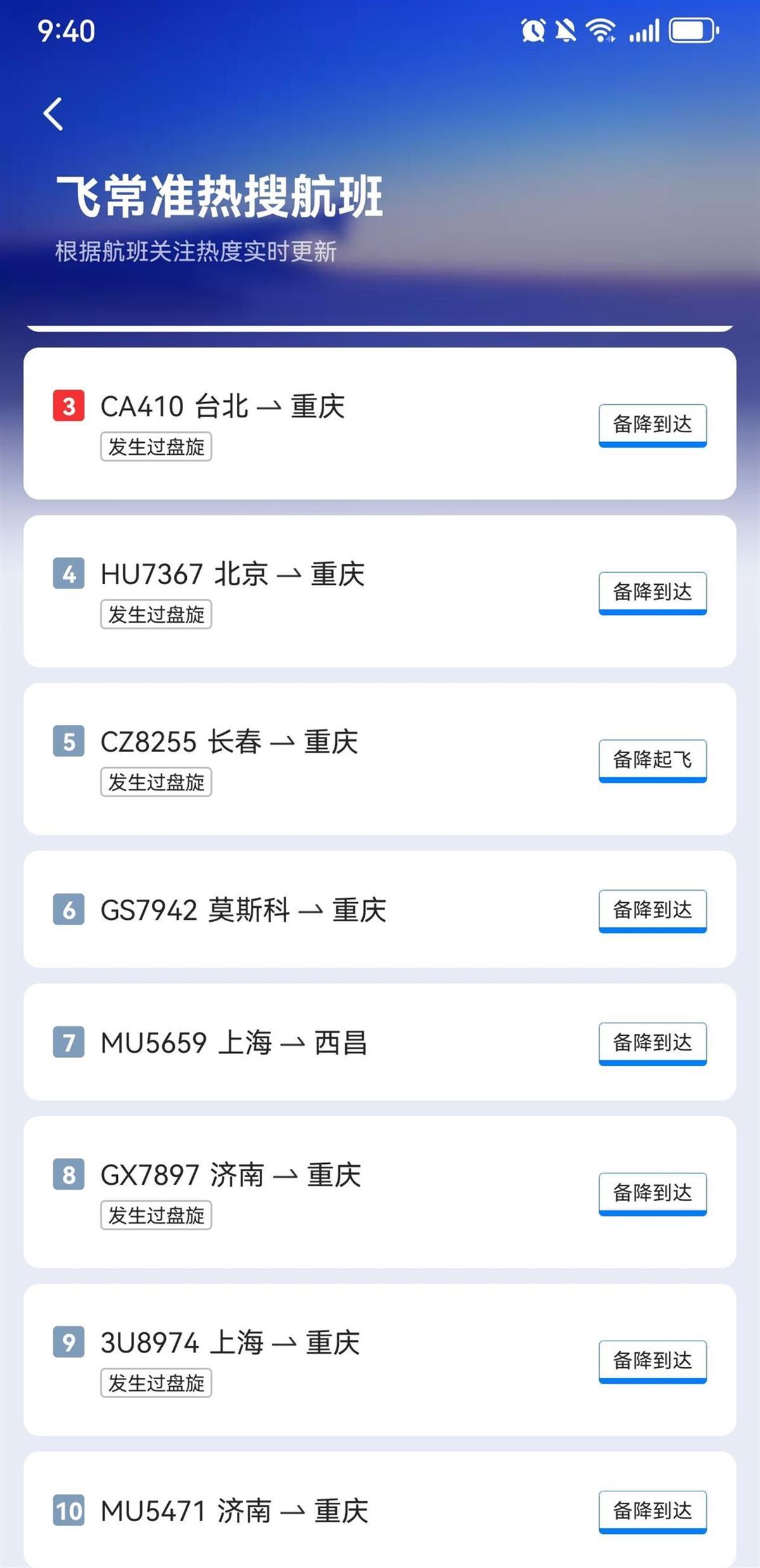 7月9日上午,飛常準熱搜航班信息顯示,多地飛往重慶的航班顯示備降,不僅有國內航班也有國際航班,包括東京飛重慶的CA434航班曾備降成都、濟南飛重慶的GX7897航班曾備降南充高坪機場、上海浦東飛重慶江北機場的3U8974航班曾備降成都雙流機場等。記者注意到,有部分航班在備降其他機場后,已經重新起飛到達重慶江北機場,比如CA434航班在備降成都后已在9日凌晨3時許降落重慶。