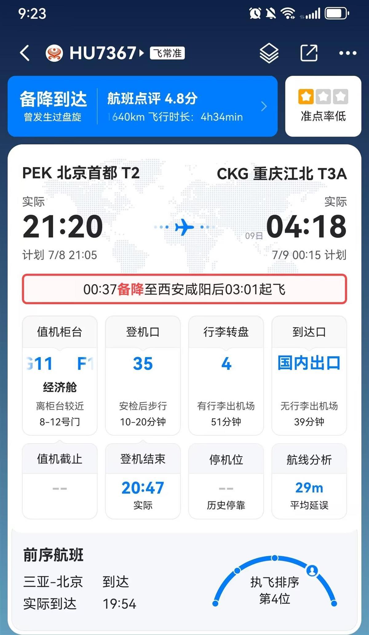 從7月8日下午到7月9日,多位網友稱,本來是直飛重慶江北機場的航班,結果因為重慶突降暴雨無法降落,最后備降成都、南充、西安等地機場。