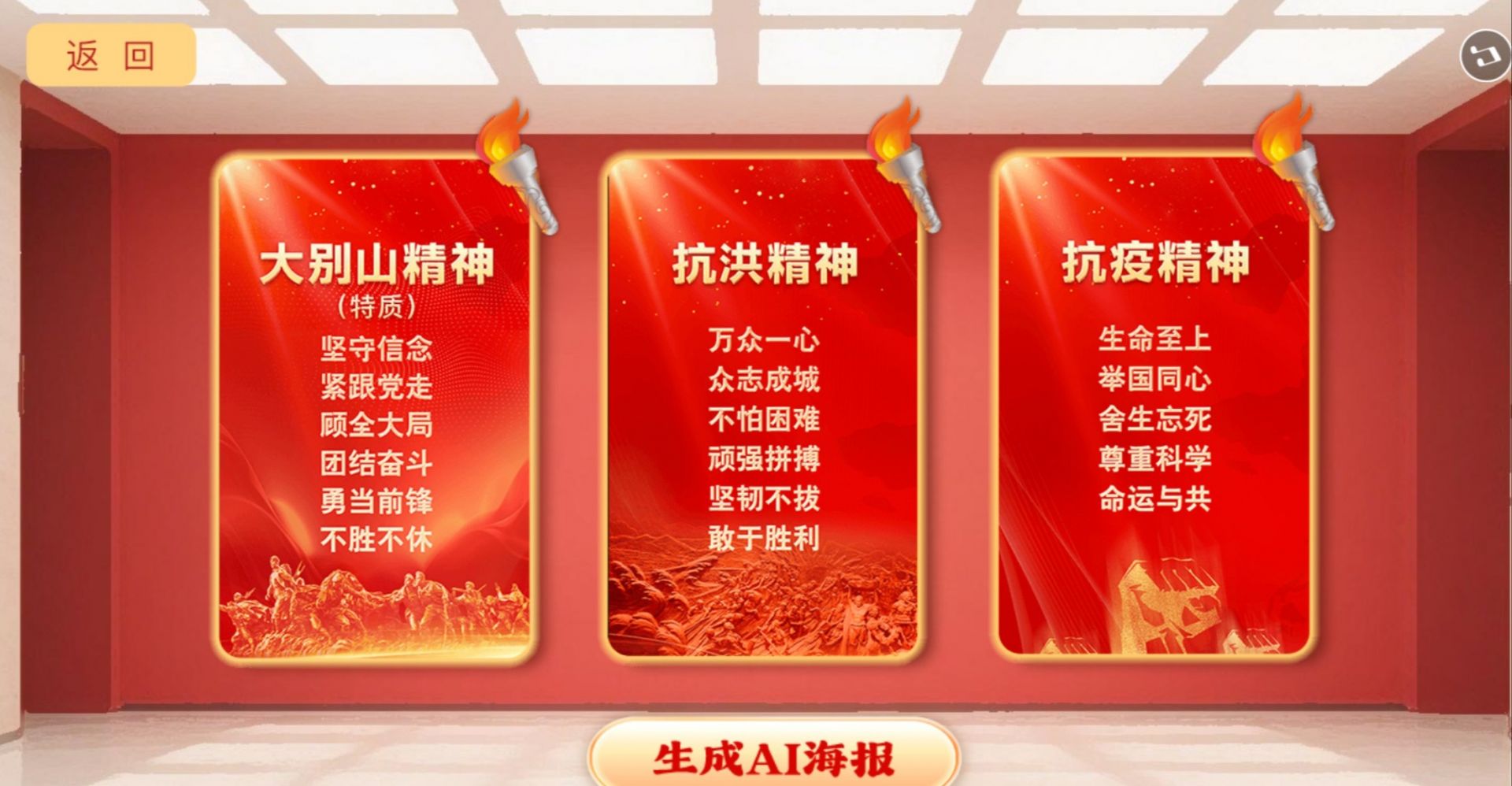 AIGC賦能內容生產,多元素交融報道,打造沉浸式紅色教育新體驗。“三大精神”數字體驗館以“數智人導引+多媒體場景呈現+AI視頻生成分享”為核心,設有“精神能量館”和“穿越體驗館”兩大主題展區,打造出集教育性、互動性、傳播性于一體的紅色“超感數字館”,讓偉大精神在用戶體驗過程中入腦入心。