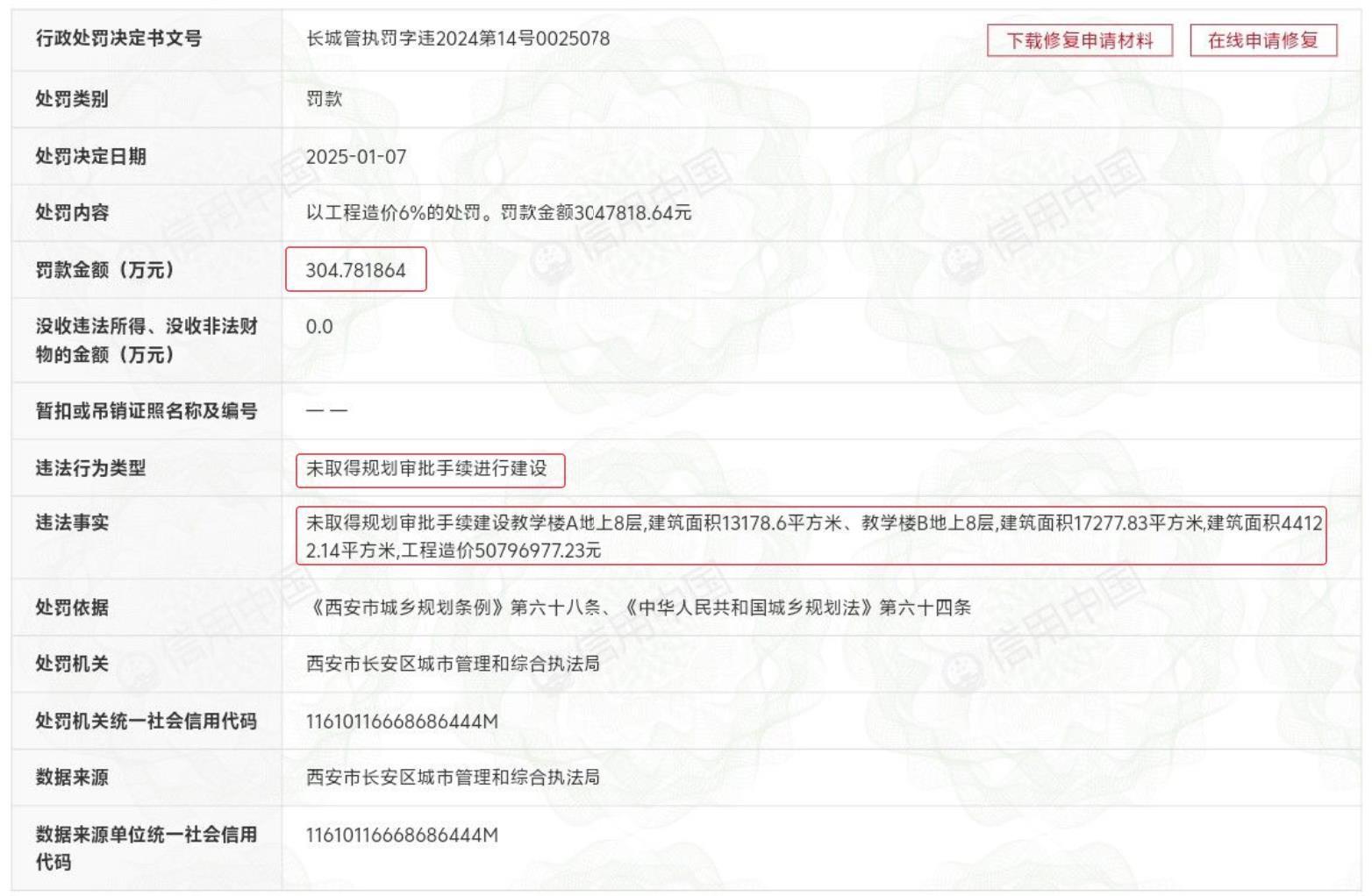 處罰信息顯示,2025年1月7日,上述7棟樓均因未取得規劃審批手續進行建設,被西安市長安區城市管理和綜合執法局處以工程造價的6%罰款,罰金共計773萬余元。