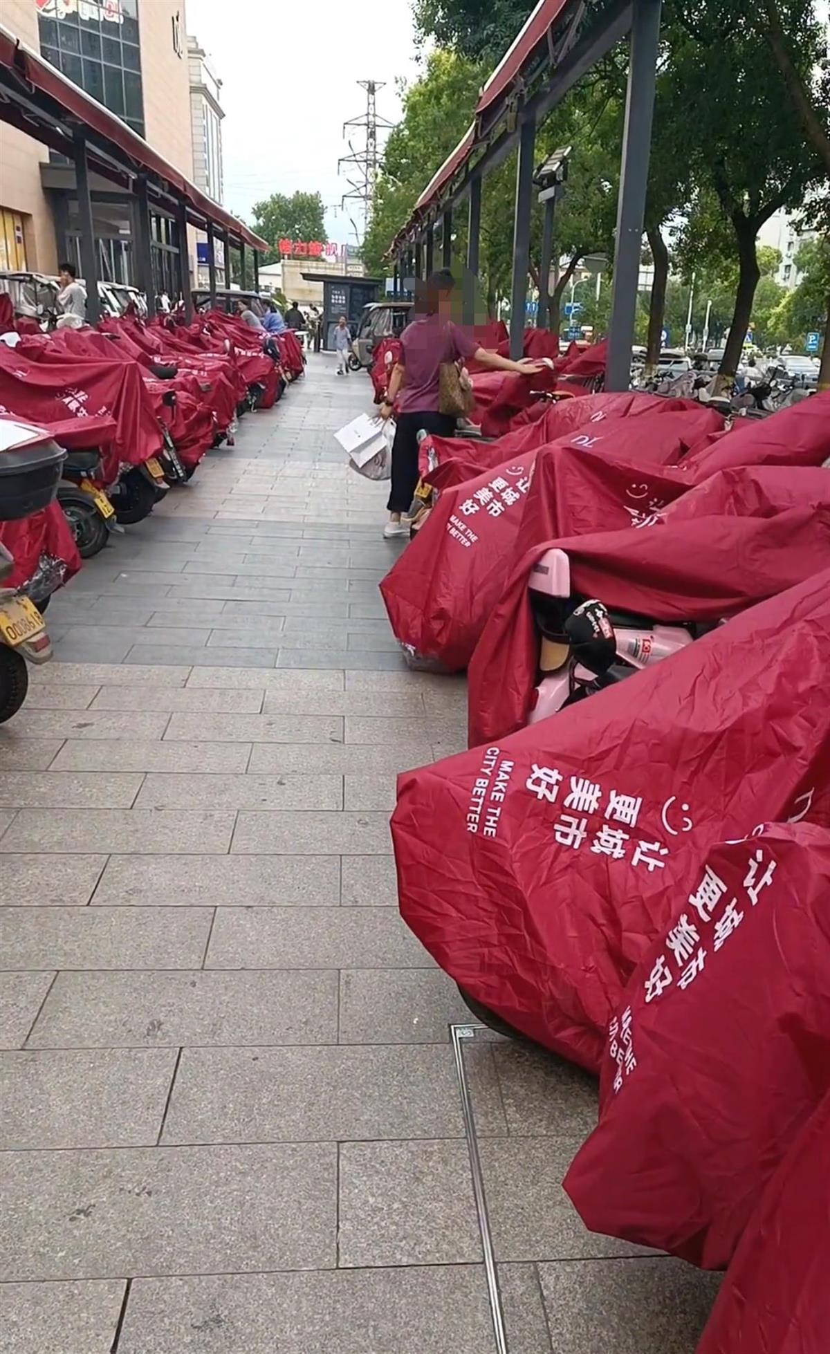 網友發布的視頻中,人行道上排列整齊的電瓶車都被“穿上”了紅色的雨披。從店內購物出來的顧客正一個個翻開雨披,尋找自己的車輛。視頻中,拍攝者笑著說,“這下好了,車主都找不到自己車了,只有挨個找?!?/p>