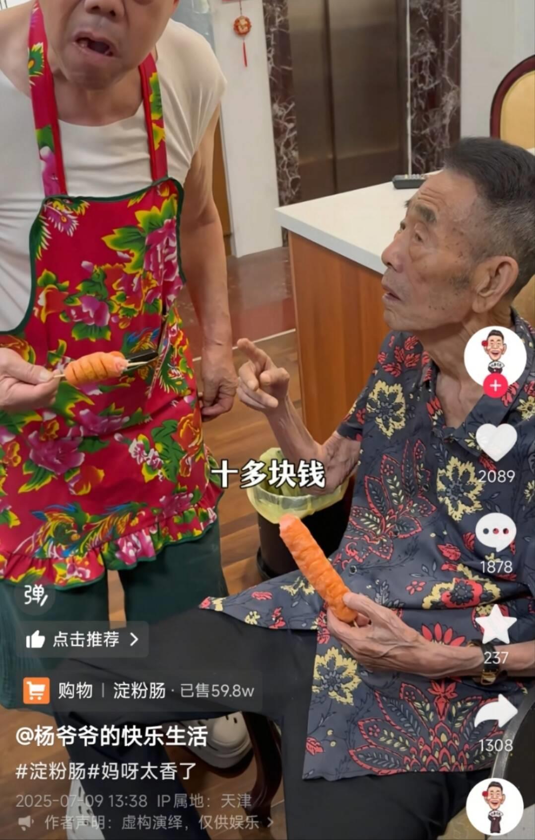 記者注意到,7月9日下午1時38分,該賬號還更新了一條視頻,楊少華和楊倫出鏡。視頻里,楊少華坐在椅子上,正在試吃淀粉腸。