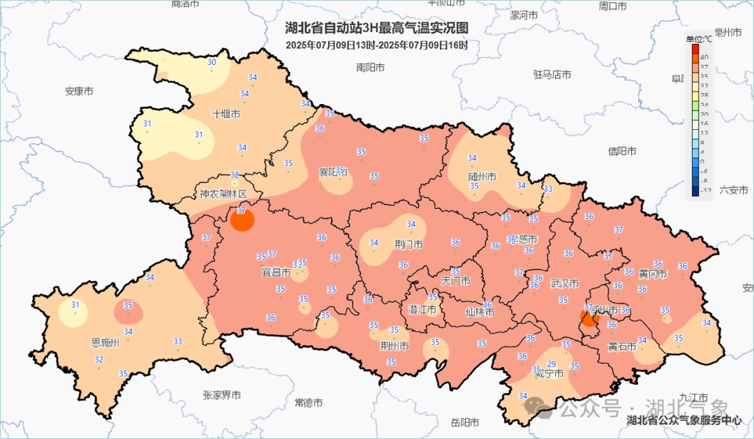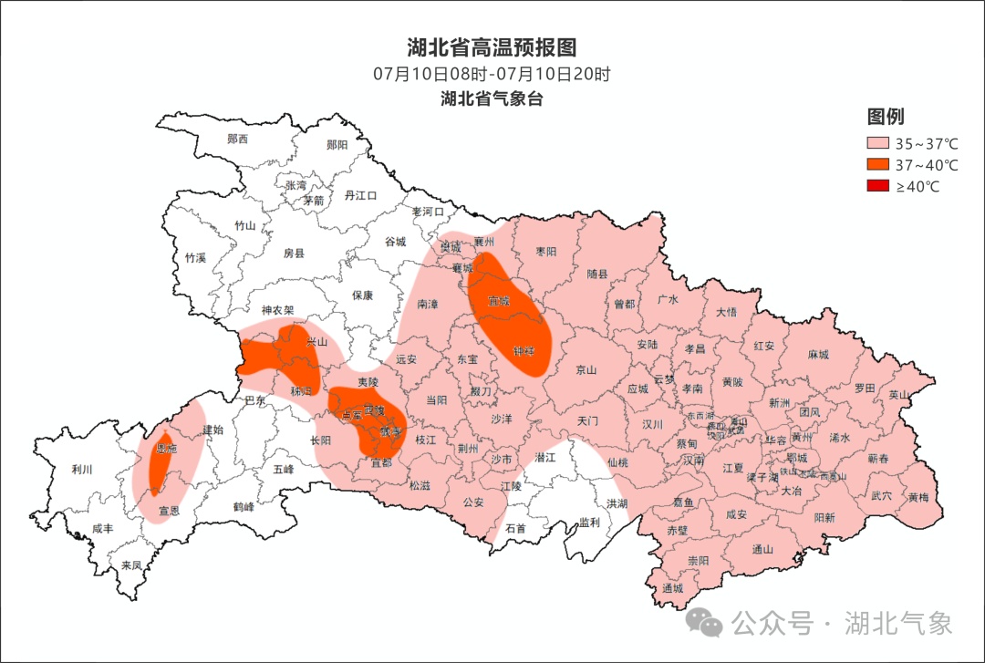 預計明天白天,恩施、宜昌、襄陽東部、隨州、荊門、荊州西部、孝感、天門、武漢、鄂州、黃岡、黃石、咸寧等地最高氣溫將升至35℃以上,其中恩施、宜昌、襄陽、荊門局地可達37~39℃,請注意防范。