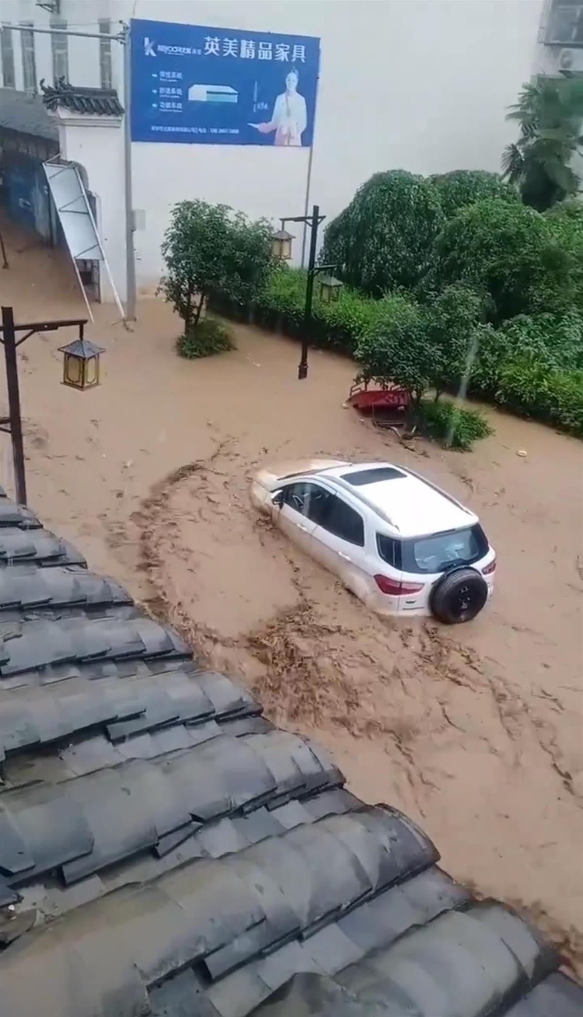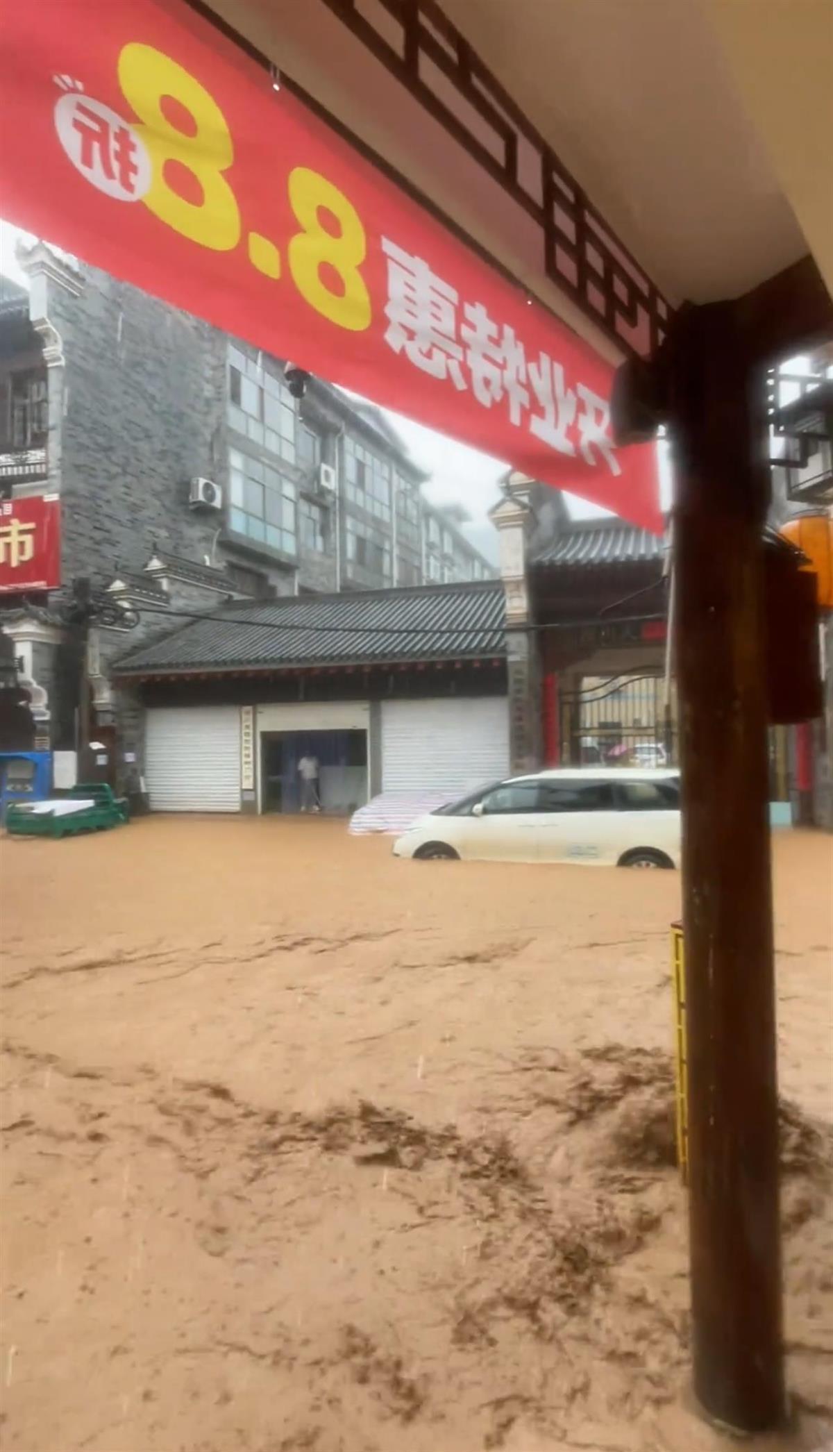 多位古鎮居民發布的視頻顯示,街道已被洪水淹沒,有車輛被水沖走,現場有裝載機正在工作。一家零食店的老板告訴記者,他家的店鋪位于一樓,已被洪水淹沒,最高時水位大概20厘米高,沒過小腿。下午4點多,洪水已經退去,目前店里正在清理淤泥,街道沒有積水了。