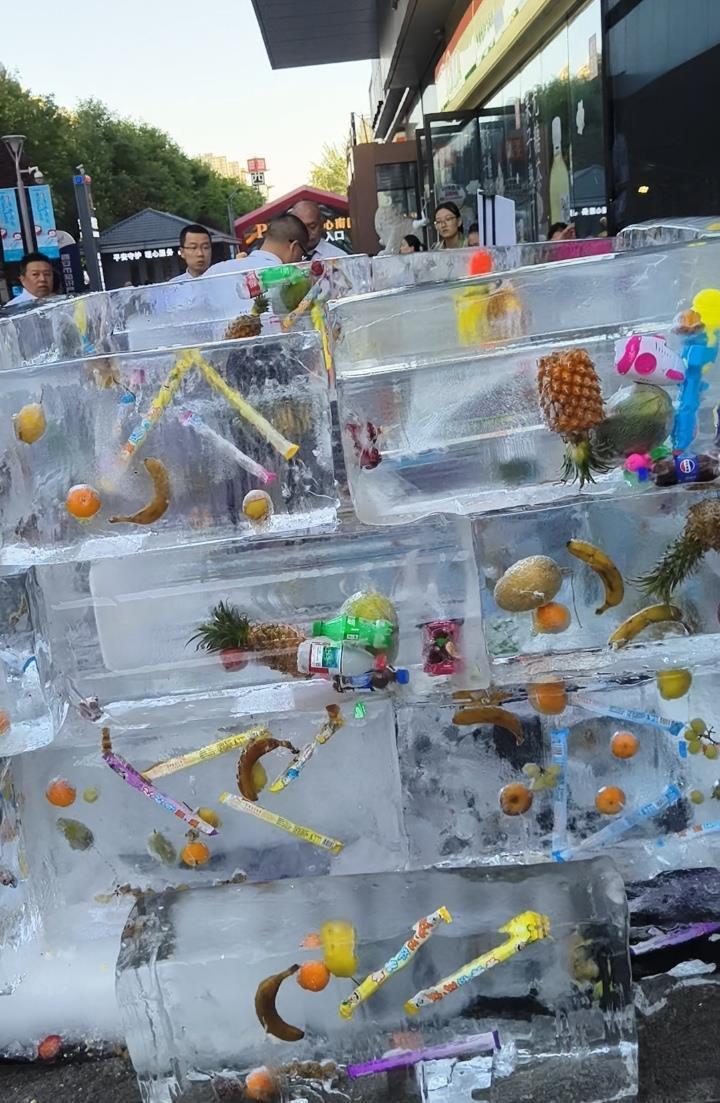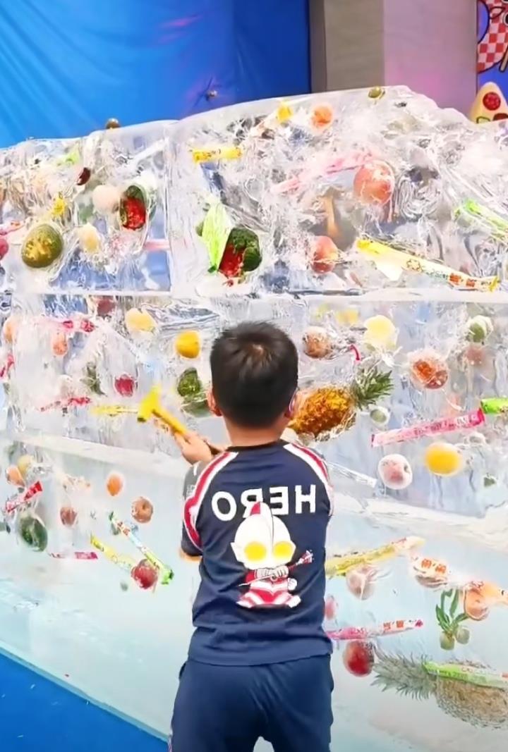 1米長、40厘米寬、20厘米厚的大冰塊里,凍著西瓜、菠蘿、冰淇淋、飲料,只要砸開就能免費拿走。7月以來,北方持續高溫,陜西、河南、河北等多地的商場、景區,開展免費砸冰尋寶活動,給市民降溫解暑。