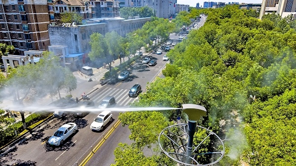 7月9日,武漢東湖高新區(qū)民族大道,14組智能噴淋裝置“上崗”,為酷暑出行的市民降溫。日前,由光谷建設公司負責實施的民族大道道路噴淋抑塵系統(tǒng)工程正式完工并投入使用。在雄楚大道至南湖大道區(qū)間約2公里長的路段上,共安裝14組智能噴淋裝置。每組裝置能覆蓋桿塔周圍25-30米的范圍,并借助微風進行擴散。經(jīng)過測算,智能噴淋裝置能有效降低周邊環(huán)境溫度近5℃。