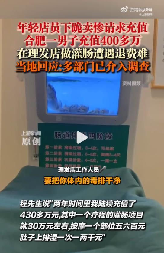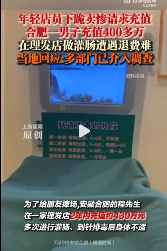 為了給朋友捧場,程先生稱在合肥一家理發店2年內充值了430多萬元,多次進行灌腸、針刺排毒后出現了身體不適。程先生查詢發現該理發店并不具備行醫資格,向門店索要剩余款項遭到拒絕。
