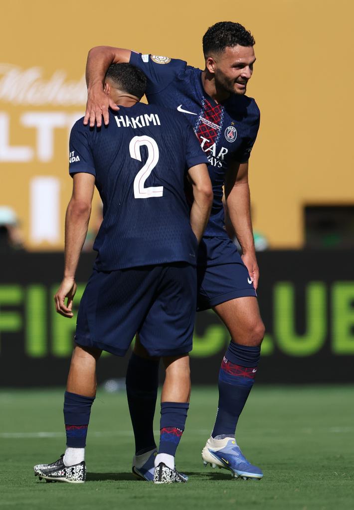 巴黎圣日耳曼隊球員貢薩洛·拉莫斯(右)打入球隊第四粒進球后與隊友阿什拉夫·哈基米慶祝。新華社記者 李明 攝