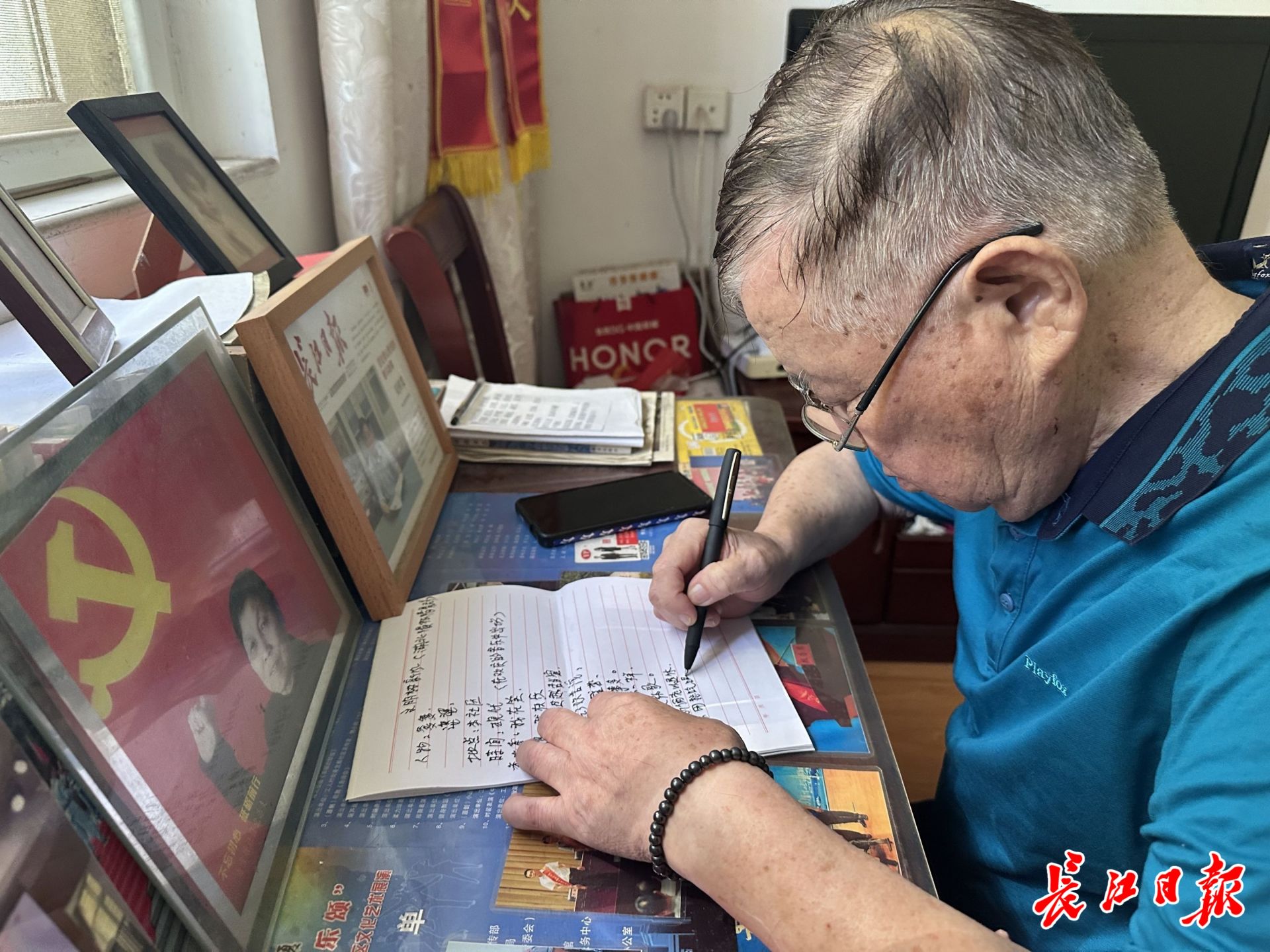 7月7日下午,青山區工人村街道青宜居社區,84歲的武鋼退休工人吳傳發在自己家中埋頭伏案,手中的墨水筆在稿紙上沙沙作響。