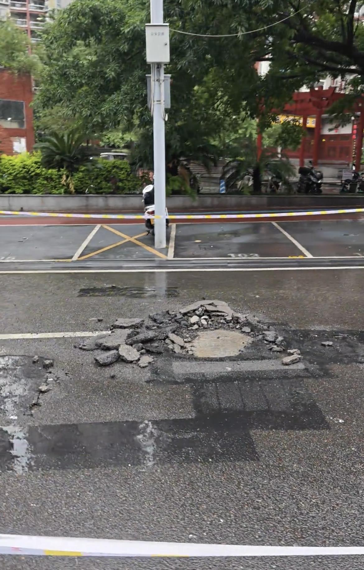 10日,發布視頻的蔣先生向極目新聞記者介紹,他的門店就位于直港大道楊家坪街,8日晚外面又是風又是雨,還不時有閃電。到9日凌晨1點左右,就聽到外面有聲音,在門口看到馬路上有些人圍著,“聽說是有人被雷擊了。”蔣先生說,天亮后看到一處窨井蓋上柏油路面被掀起,居民都在議論,稱該處路面是被雷擊掀翻的。