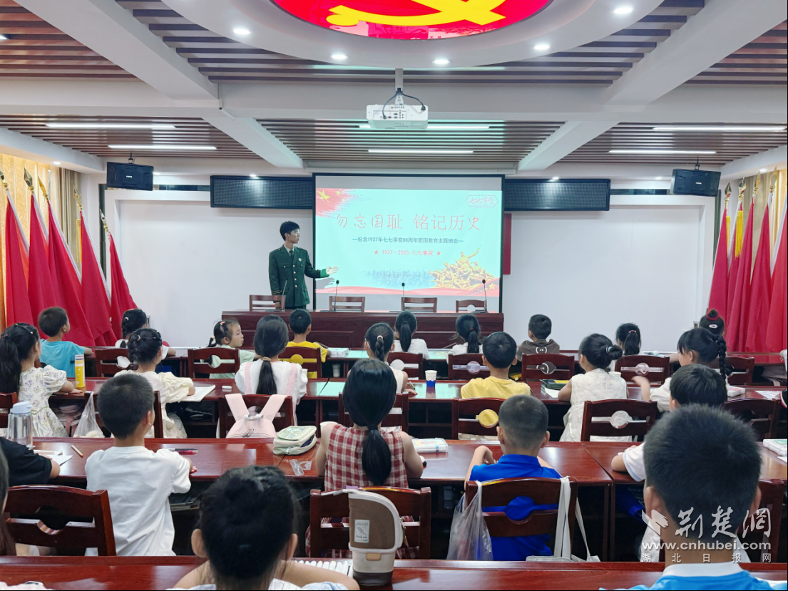 武漢工程科技學院退役大學生劉卓身著軍裝,以七七事變為歷史切入點,從軍人視角出發,將那段山河破碎的屈辱記憶與如今國家國防建設的蓬勃發展相對照,向孩子們生動講述“七七事變”的歷史意義。