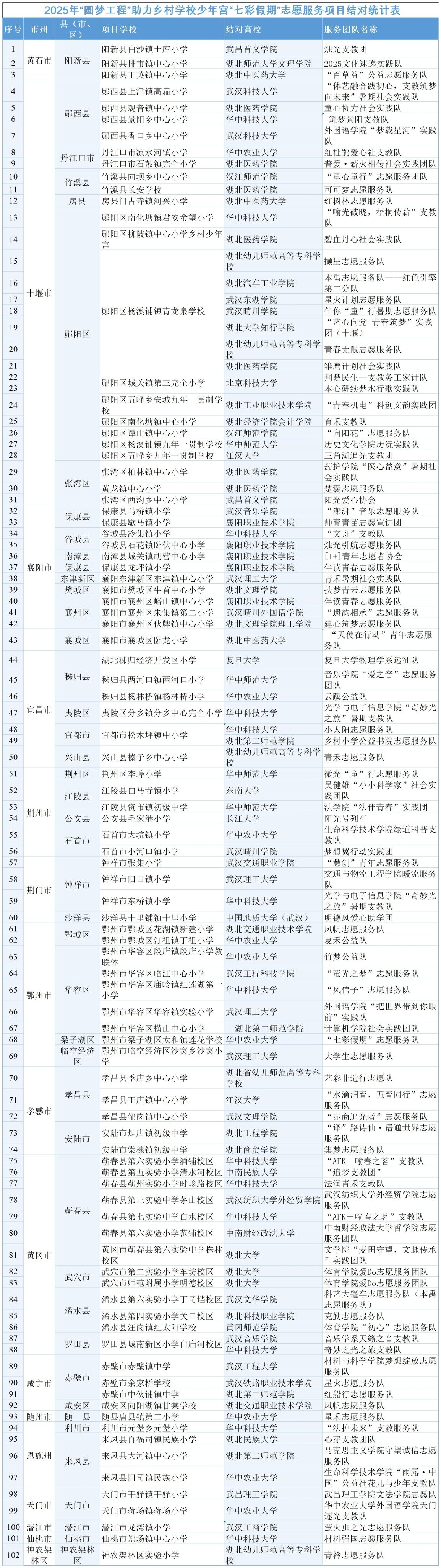 截至目前,通過征集承接項目學校、高校自主申報以及雙方溝通,全省16個市(州)102所鄉村學校少年宮項目學校已完成了項目結對,并開始利用暑期,依據標準課程設計,在結對項目學校開展不少于14天的“七彩假期”志愿服務活動。