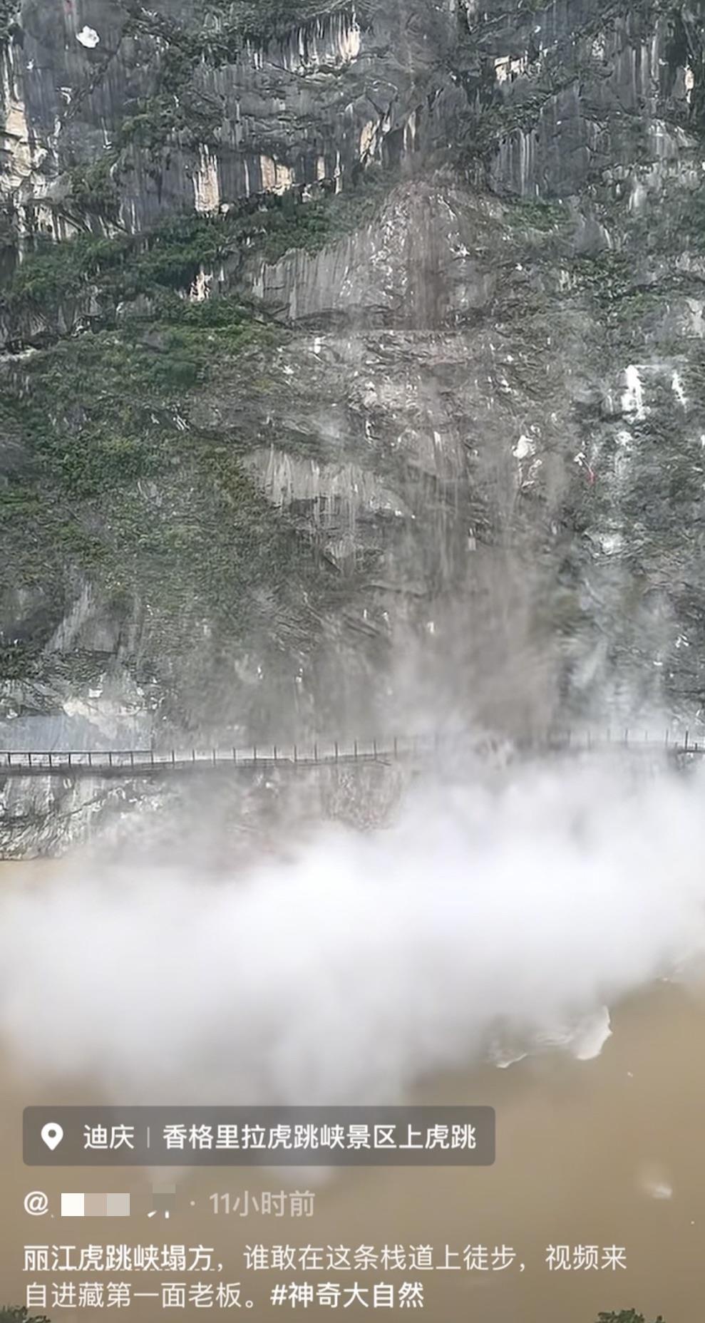 7月9日,有網友在社交平臺發布視頻,稱“麗江虎跳峽塌方”,并配文“誰敢在這條棧道上徒步”。視頻畫面顯示,有碎石從山坡滑落至金沙江中,激起白色水霧。