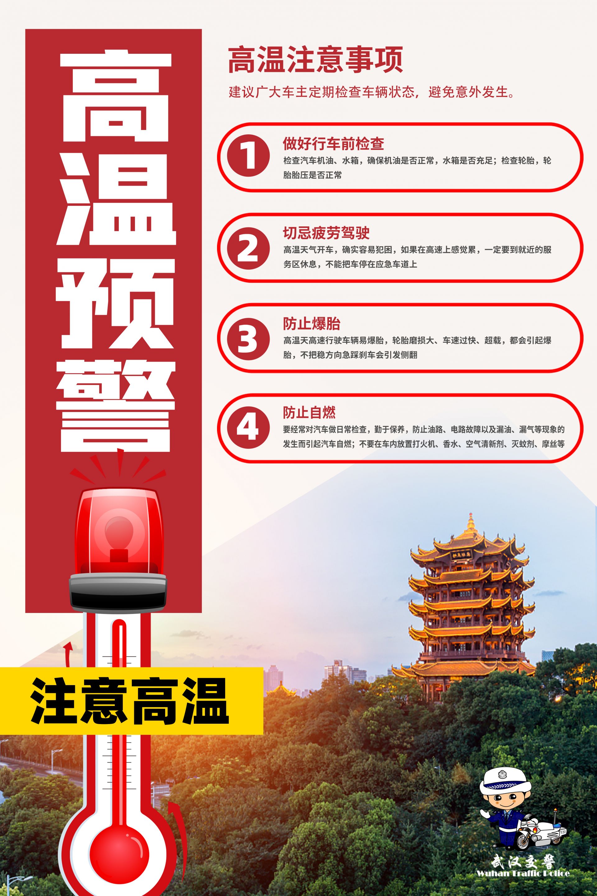 荊楚網(湖北日報網)訊(通訊員 熊文嘉 張鵬 施峰)各位武漢的車主朋友們,夏季高溫來襲,開車出行如同經歷“桑拿烤驗”。7月10日,武漢交警貼心為車主準備高溫行車指南,助大家防風險、巧避險、懂理賠,確保行車安全!