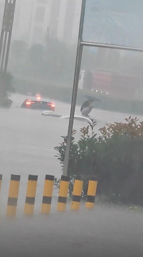 視頻顯示,現(xiàn)場(chǎng)下著大雨,一名男子打著傘蹲在車(chē)頂,周邊積水眼看就要沒(méi)過(guò)車(chē)頂。