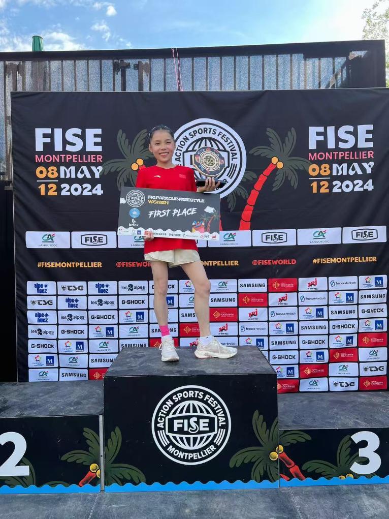 商春松在2024年跑酷世界杯蒙彼利埃站比賽中登上冠軍領獎臺。