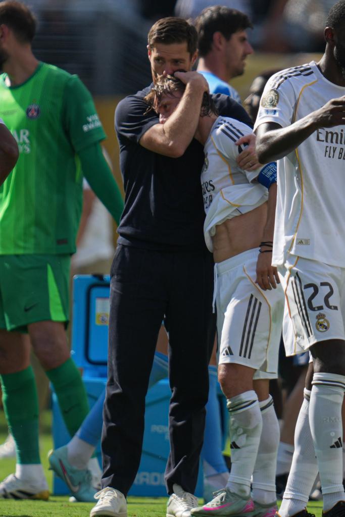 皇馬隊主教練阿隆索(左)賽后擁抱球員莫德里奇。這是莫德里奇效力皇馬的最后一場比賽。新華社記者 黃宗治 攝