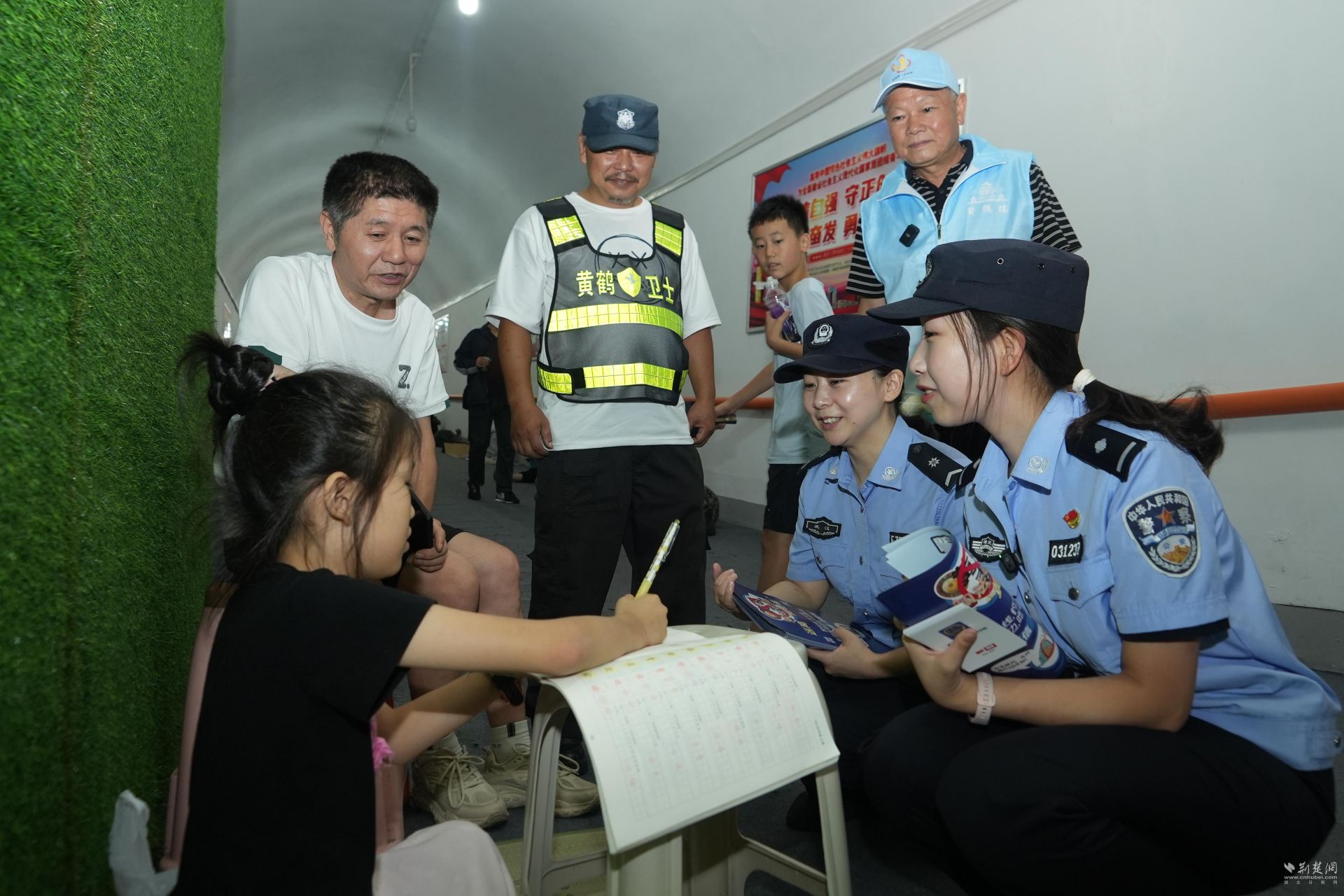 清涼舒適的環境不意味著安全防范可以松懈,身著“藍襯衣”的民警,攜手 “紅馬甲”的社區干部以及熒光黃的“黃鶴衛士”,一同將安全守護的陣地延伸到了這片清涼之地。