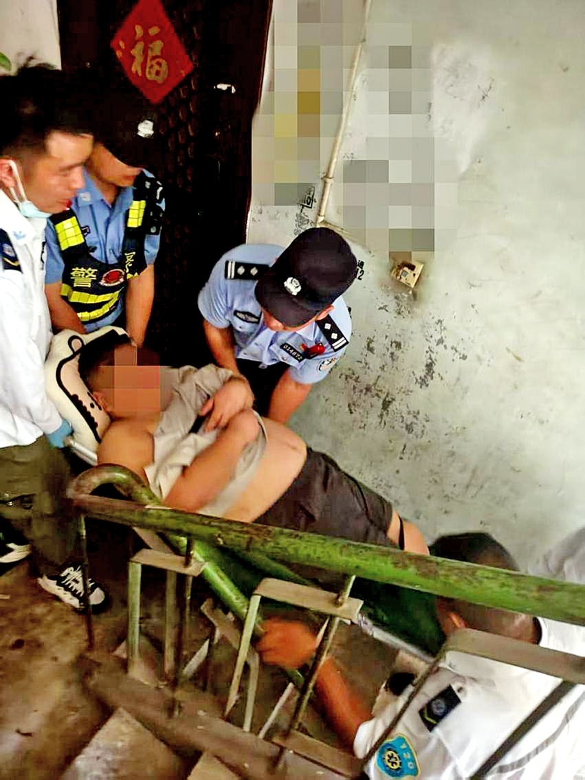 梅先生住在7樓,只能用擔架把梅先生抬下樓。“一、二、三,起!”4雙大手抓住擔架,民警陳志武、輔警易壽生與2名急救人員同時使力,把梅先生抬出大門。樓道十分狹窄,擔架很難轉彎,200多斤的重量,讓每下一步臺階都十分艱難。4人相互提醒,不斷調整姿勢,保持擔架平衡。把梅先生從7樓家中抬出樓道,足足用了將近半個小時,民警陳志武、輔警易壽生與2名急救人員渾身被汗水濕透,終于把梅先生抬上了救護車。