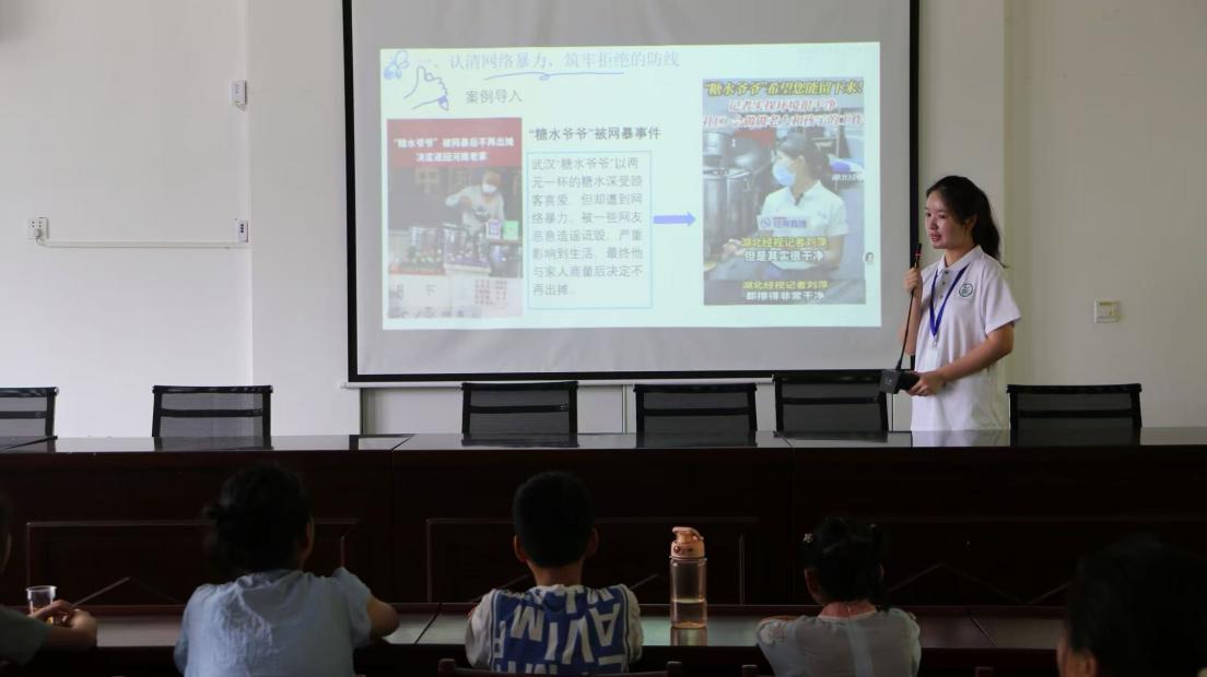 授牌儀式結束后,志愿者們通過精心制作的幻燈片,為小朋友們帶來了一場關于網絡文明的知識盛宴。幻燈片內容涵蓋了網絡詐騙、謠言識別、網絡文明禮儀、暴力防范以及網絡防沉迷等多個方面,每個板塊都配以生動的圖文,并結合視頻資料,將理論知識與實際案例相結合,讓小朋友們深刻感受到網絡文明的重要性,以及不文明行為可能帶來的嚴重后果。