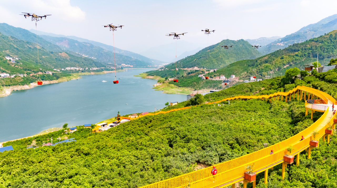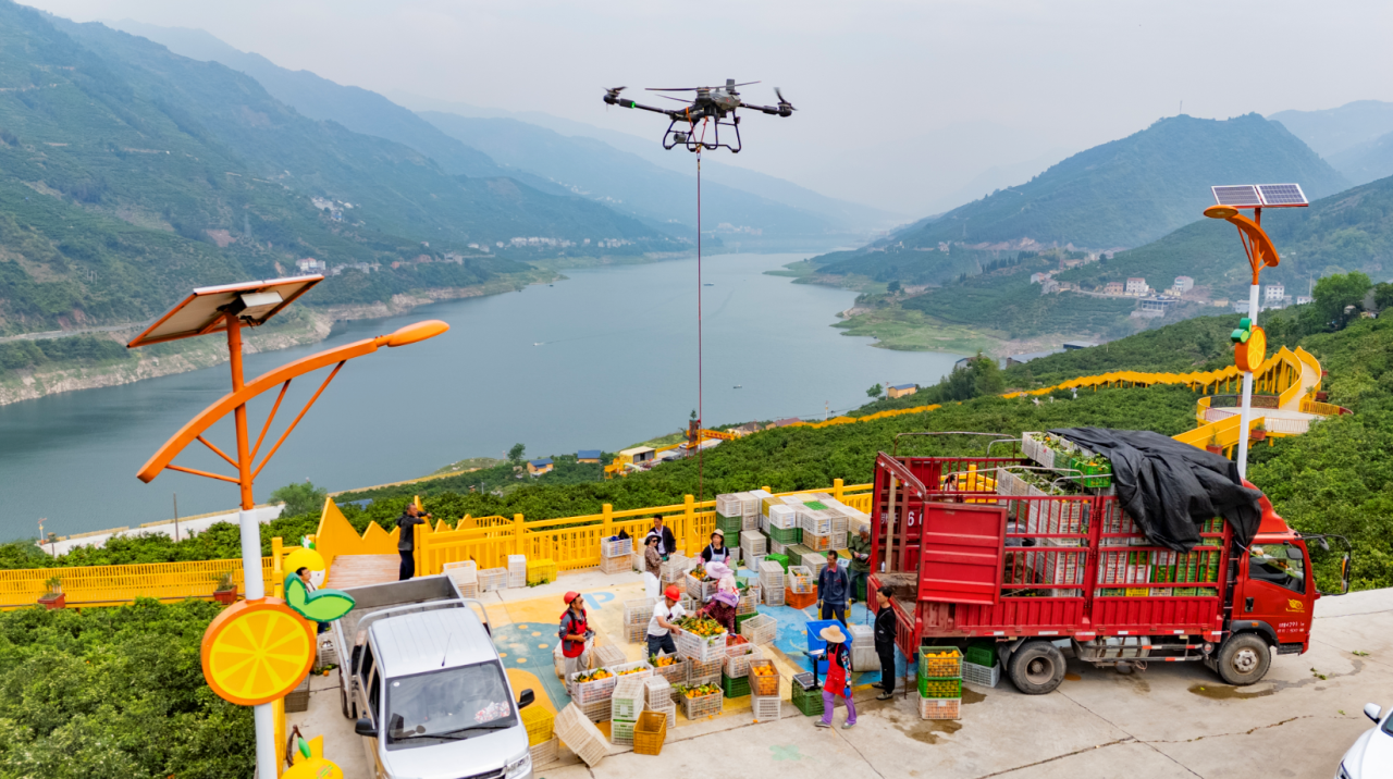 7月9日9時,秭歸縣泄灘鄉陡峭的橙園上方,4架無人機如同輕盈的飛鳥,穿梭于山壑之間,將滿載秭歸夏橙的果筐穩穩吊運下山。