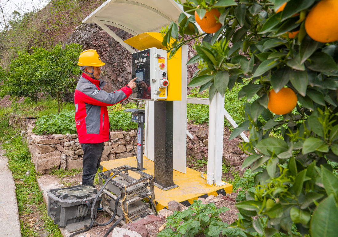 秭歸縣郭家壩鎮一飛手吊運臍橙并用無人機充電樁為電池充電。通訊員 周仕偉 攝