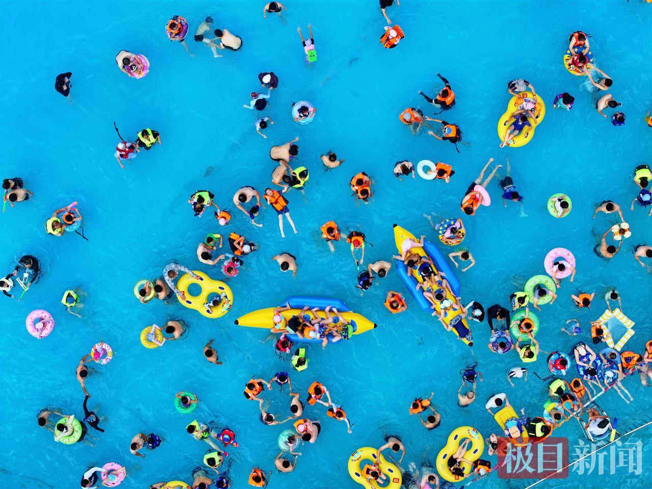 當(dāng)日下午,在漢陽(yáng)區(qū)月湖天然水上樂(lè)園內(nèi),近百名中小學(xué)生在家長(zhǎng)的看護(hù)下在淺水區(qū)嬉戲,多名救生員在池邊巡護(hù)。