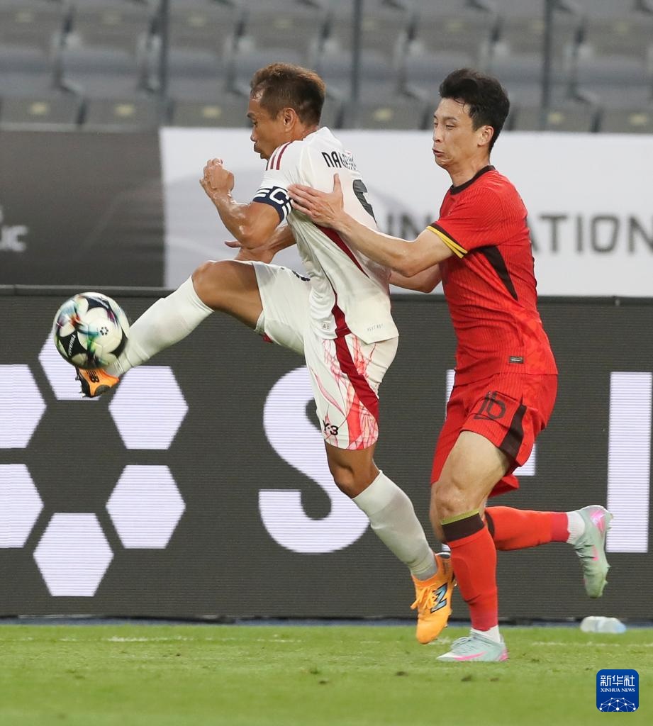 7月12日,中國隊球員巴頓(右)與日本隊球員長友佑都在比賽中拼搶。