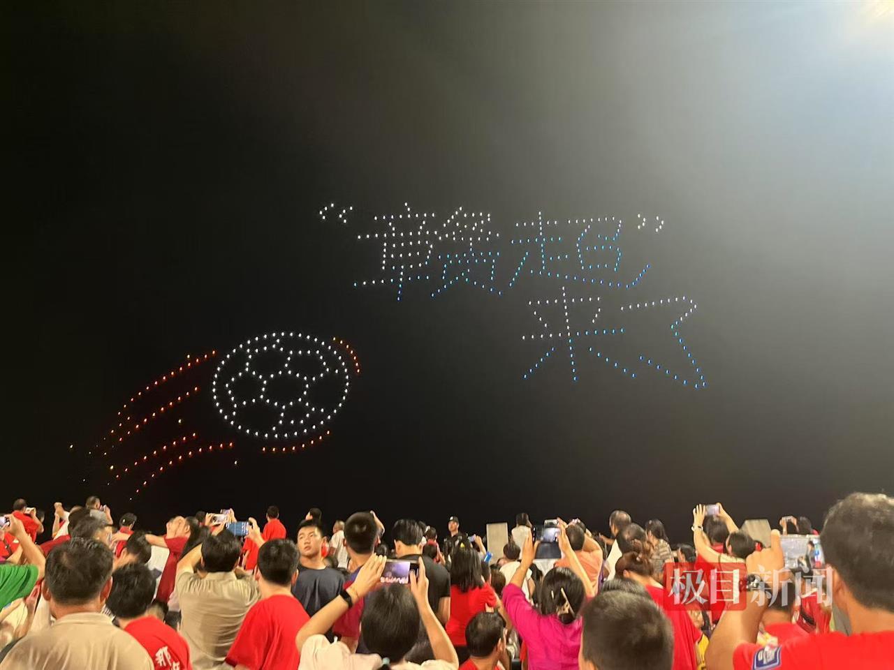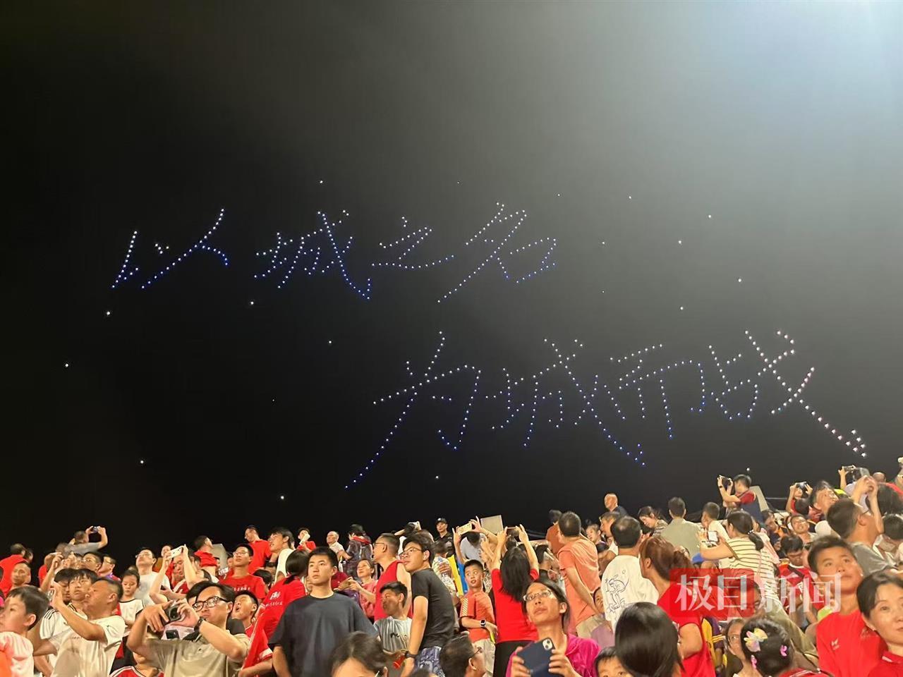 在場館上方,無人機集群點亮夜空,無人機一會像星星閃爍,一會組成不同的形狀和文字,比如“以城之名,為城而戰”“贛超來了”。無人機表演十分亮眼,觀眾紛紛站起身拍照和錄像,不時發出驚呼。