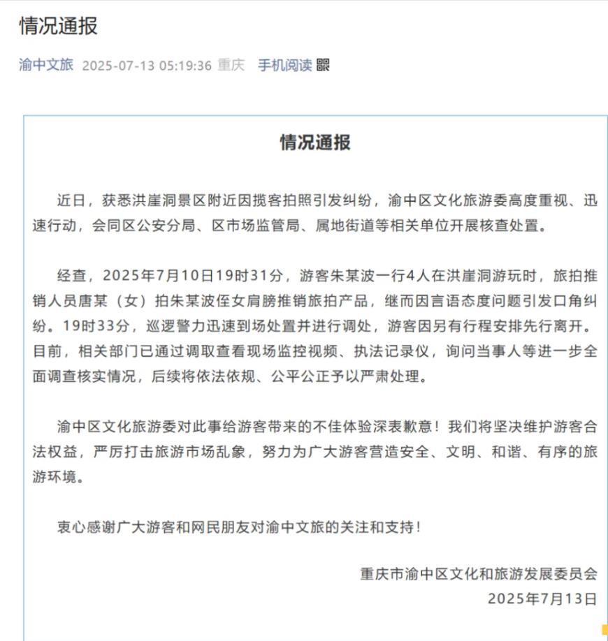 7月13日,重慶渝中文旅發布關于“洪崖洞景區旅拍攬客引發糾紛”的情況通報稱,2025年7月10日19時31分,游客朱某波一行4人在洪崖洞游玩時,旅拍推銷人員唐某(女)拍朱某波侄女肩膀推銷旅拍產品,繼而因言語態度問題引發口角糾紛,后續將依法依規、公平公正予以嚴肅處理。(據7月13日頂端新聞報道)