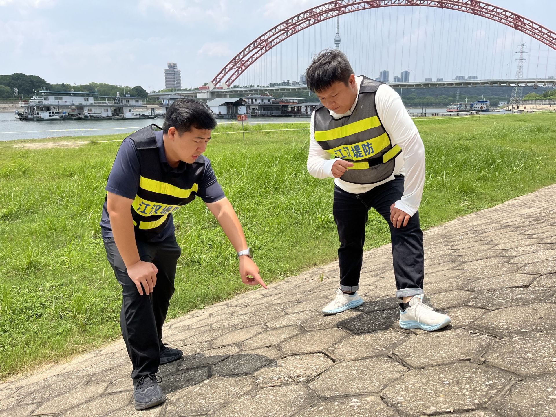 在江漢區(qū)龍王廟沿河大道旁的堤坡上,戎明磊(左)和同事觀察護(hù)坡石破損情況。長(zhǎng)江日?qǐng)?bào)記者宋磊 攝