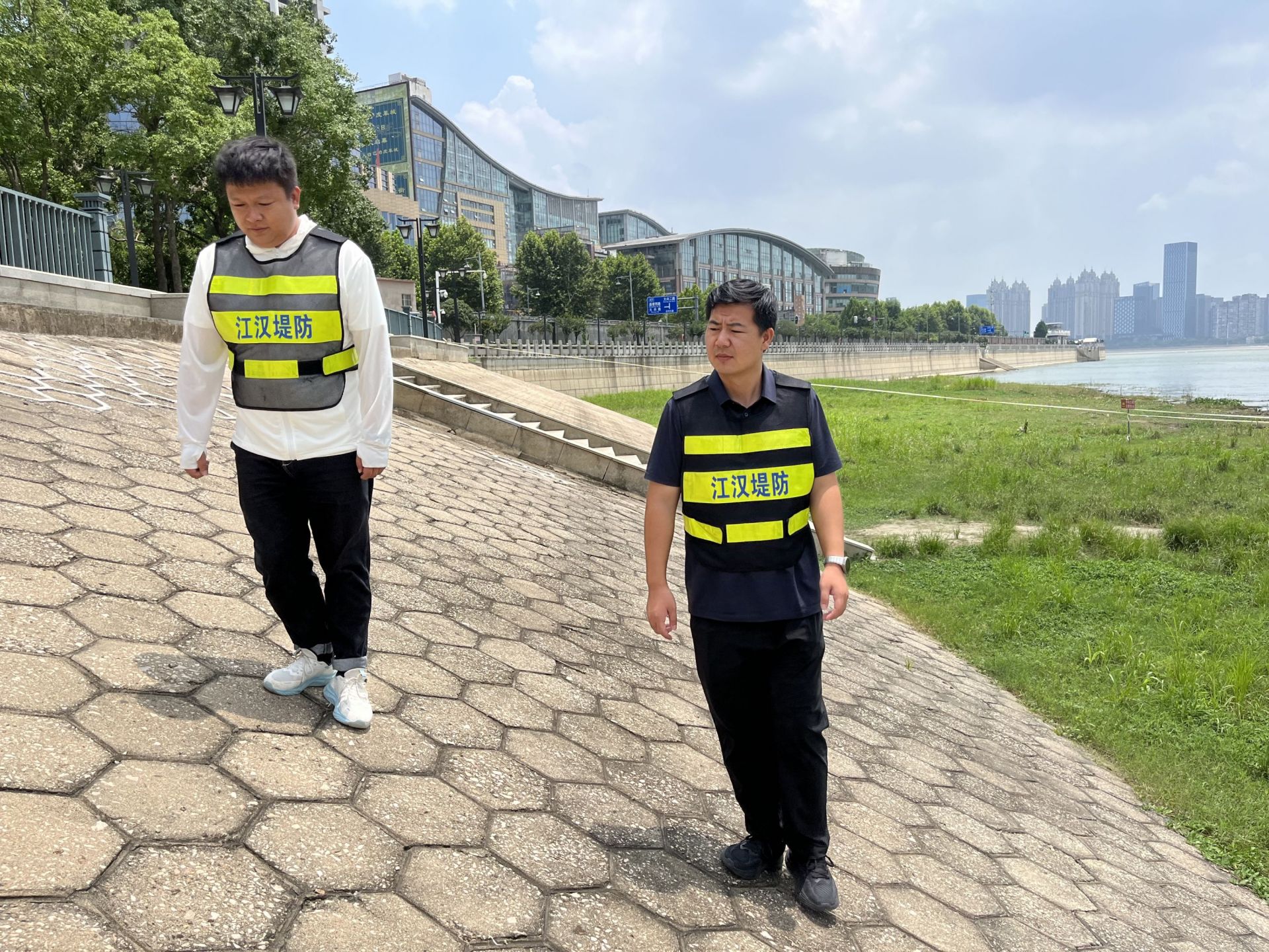 2.13公里的堤防岸線,戎明磊(右)平均每天要與同事走兩個(gè)來(lái)回。長(zhǎng)江日?qǐng)?bào)記者宋磊 攝