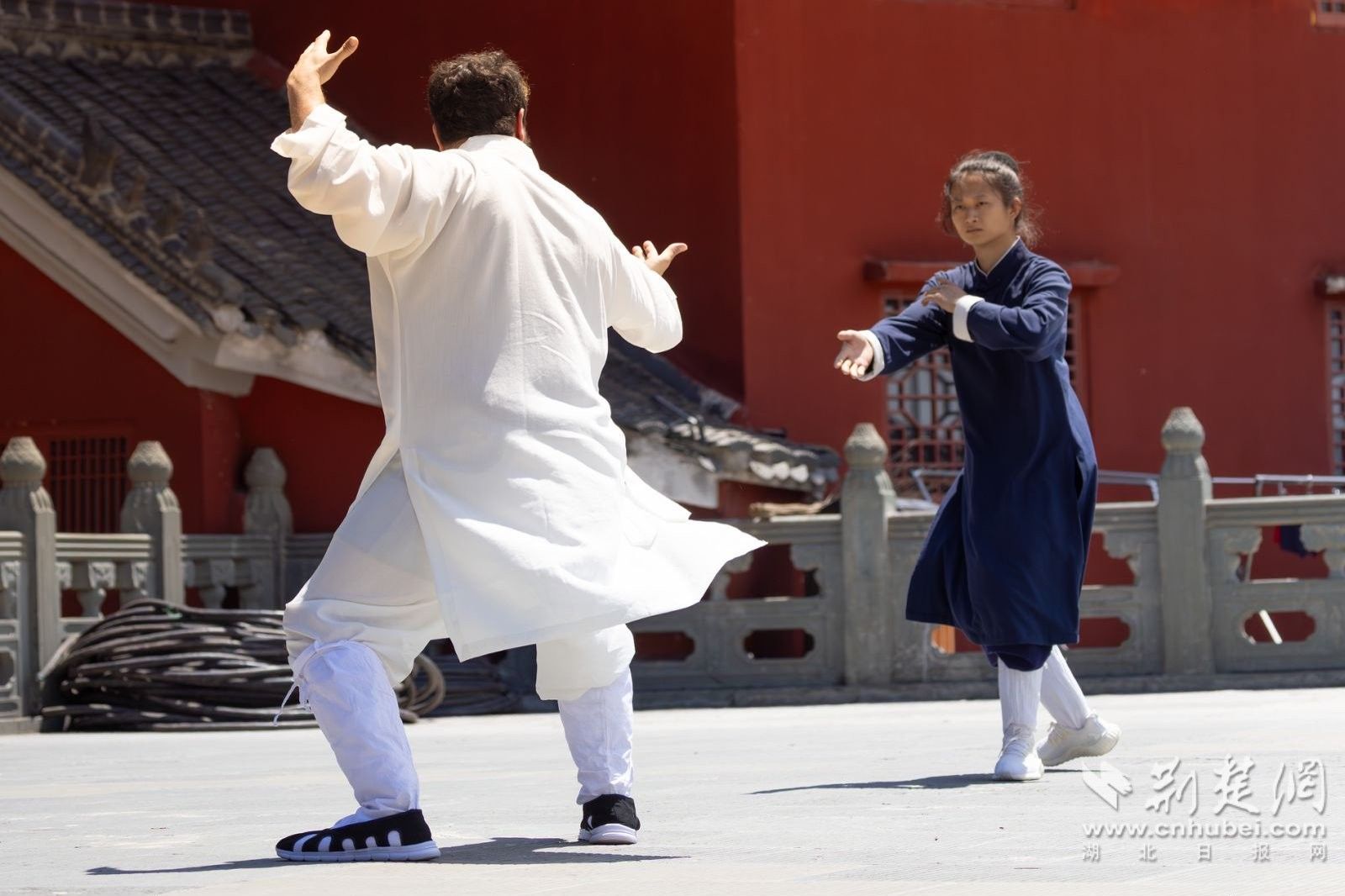 27日上午,武當山金頂,在藍天白云的映襯下,身著中式練功服、金發碧眼的保保熊與身形飄逸、身手矯健的武當山袁道長相對而立,準備比武。熱鬧的一番比試引得現場游客紛紛駐足。