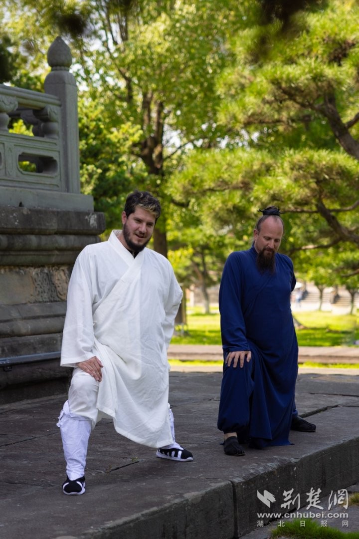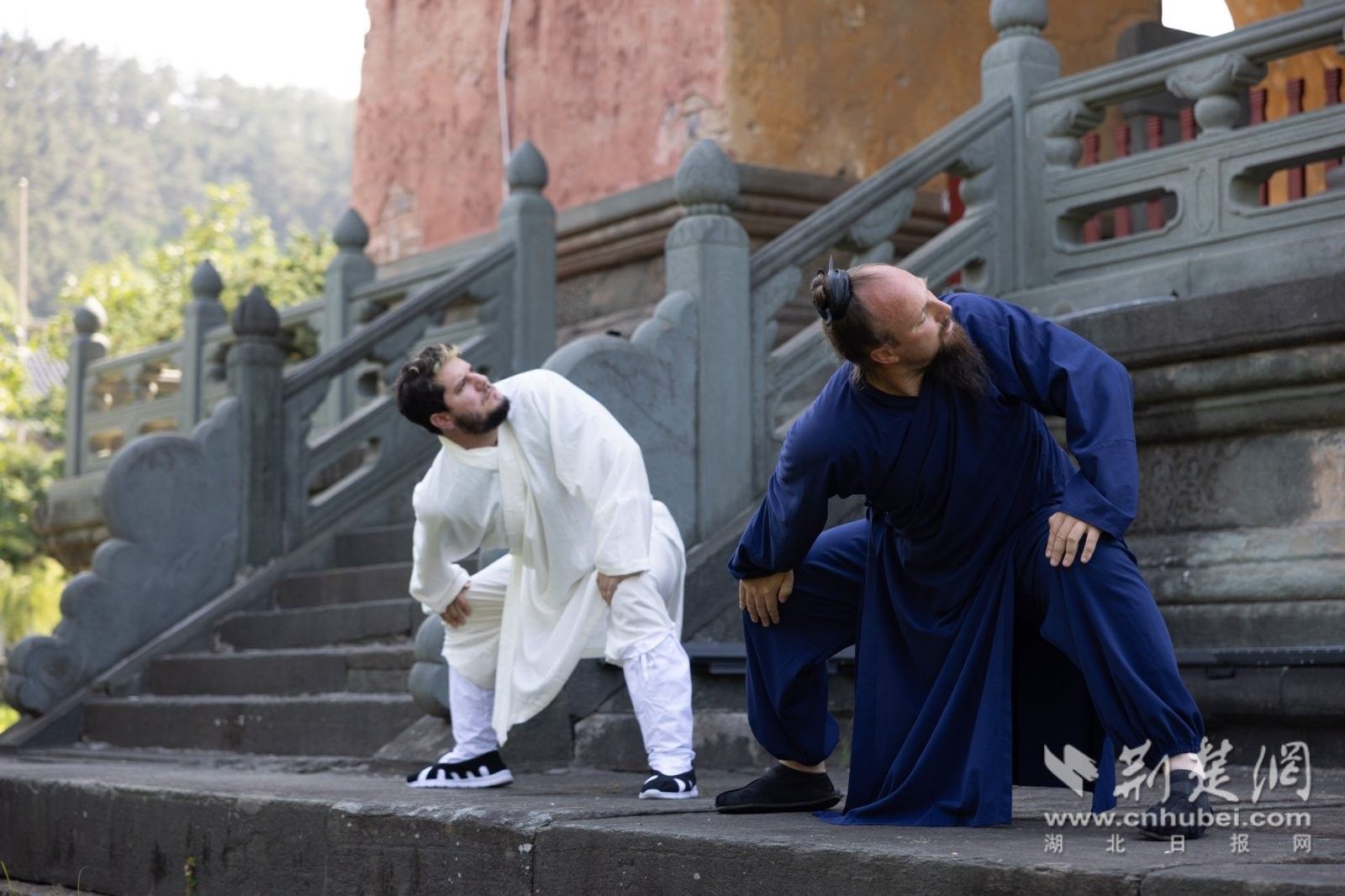 杰克著一襲道袍現身,長髯拂胸,長發盤髻。老鄉見老鄉,二人一見面便用母語開始交流。杰克帶領保保熊參觀玉虛宮,講解其中的歷史文化。在武當山見面,少不了學習中國功夫。隨后這兩位“老外”,身著中式練功服,用英語傳授口令,練起了太極拳。