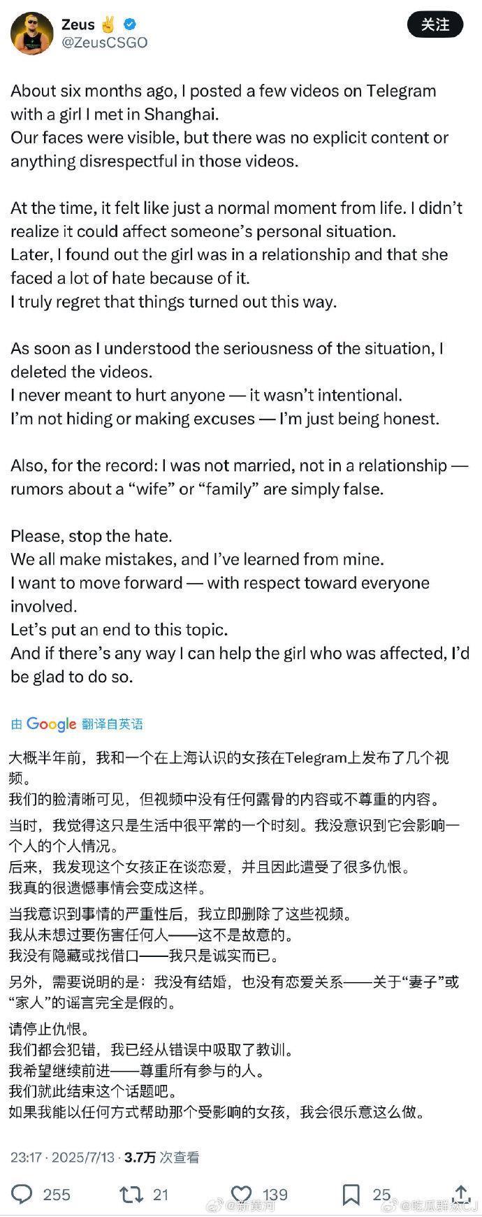 7月14日,Zeus在社交平臺發文回應,他表示,他所發的視頻中沒有任何露骨的內容或不尊重的內容,也沒有發表過不尊重中國女性的言論,并辟謠網傳結婚生子傳聞,喊話網友停止仇恨言論,并表示希望能盡快結束此事。(據7月14日新黃河客戶端)