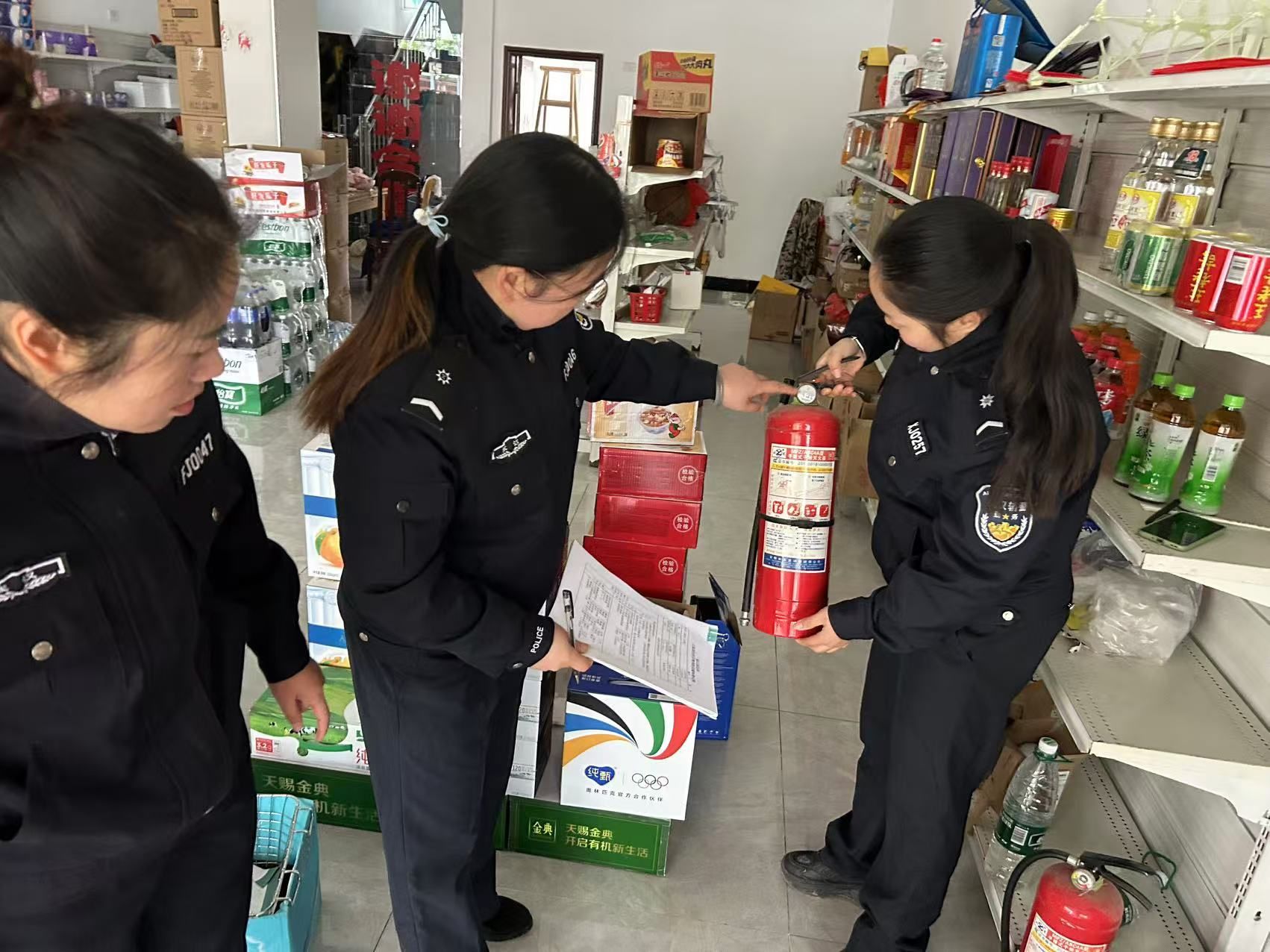 “楓警娘子軍”李婷、權嫻、肖克英在超市進行消防檢查