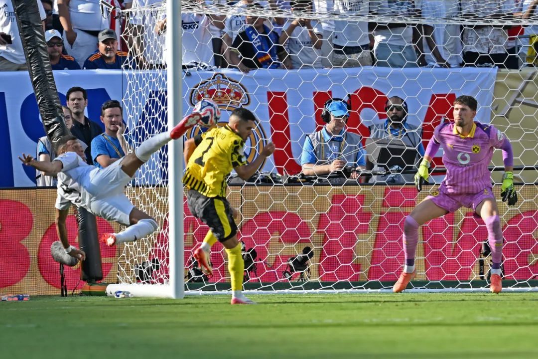7月6日,皇家馬德里隊球員姆巴佩(左)在比賽中凌空射門得分。新華社記者 李睿 攝