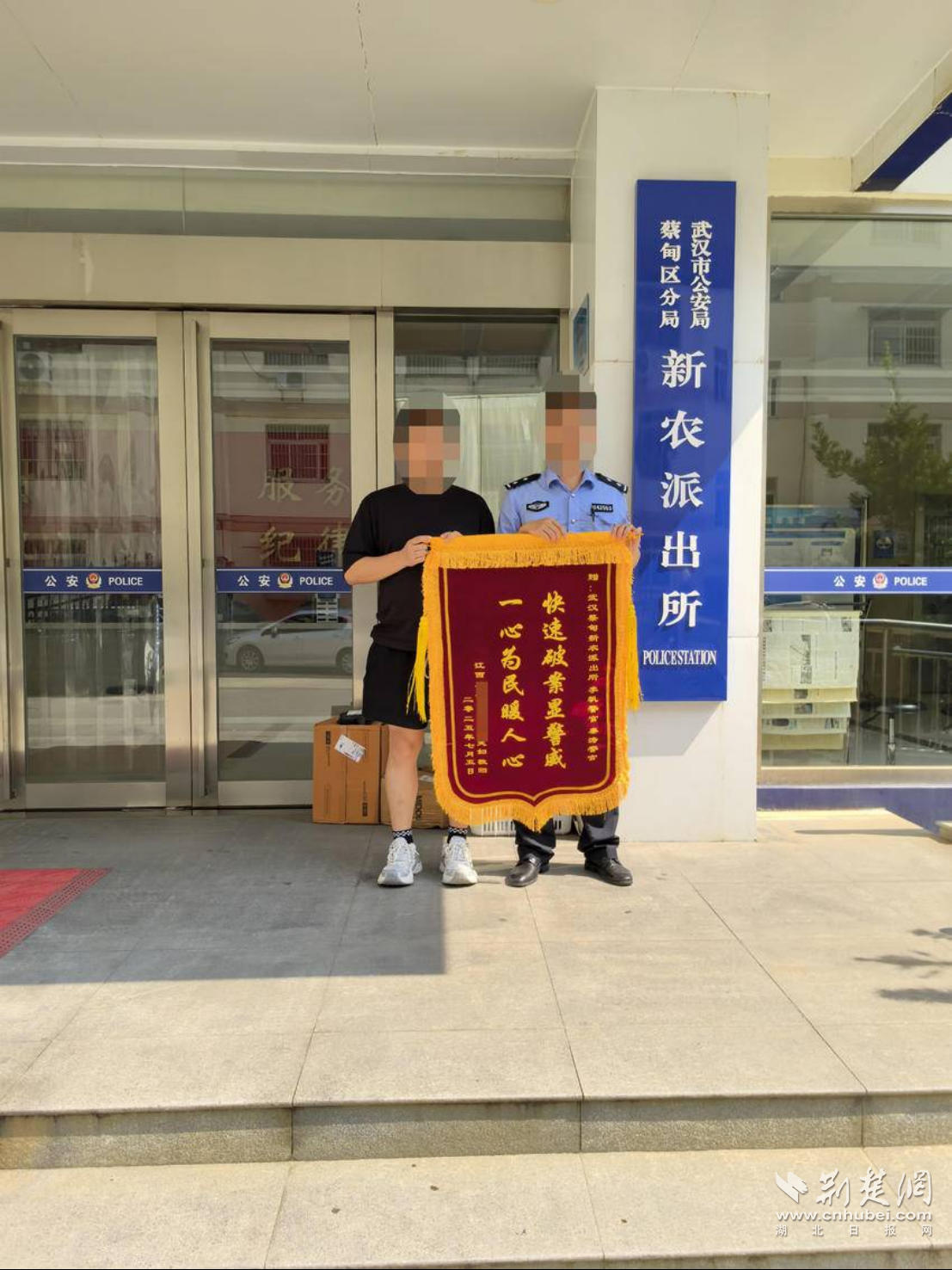 7月8日,于女士專門在“武漢城市留言板”上留言。她的朋友受托也專程來到新農派出所,送上了一面承載著無聲敬意的鮮紅錦旗。