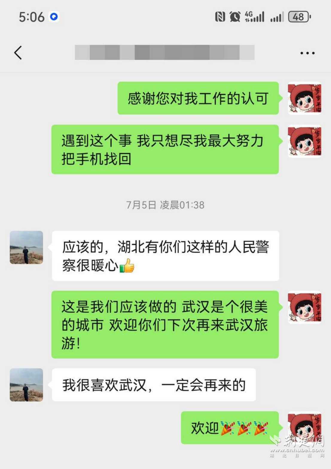 回到酒店,她難抑激動,在微信中向李帆致謝:“湖北有你們這樣的人民警察很暖心!幫我們解決了大困擾,我很喜歡武漢,一定會再來。”