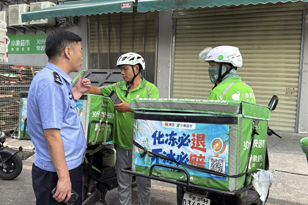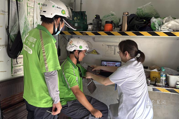 “師傅們快進來歇歇腳,喝杯酸梅湯解解暑!”工會志愿者和“兩新”組織居然智家余家頭店的工作人員向戶外工作者發放解暑涼飲。外賣騎手張師傅接過酸梅湯一飲而盡,直呼“夠地道、夠解渴”。工會志愿者還為新就業群體送上包含藿香正氣水、冰涼袖套、驅蚊花露水等“清涼禮包”,并叮囑他們合理安排作息時間,做好高溫防護。