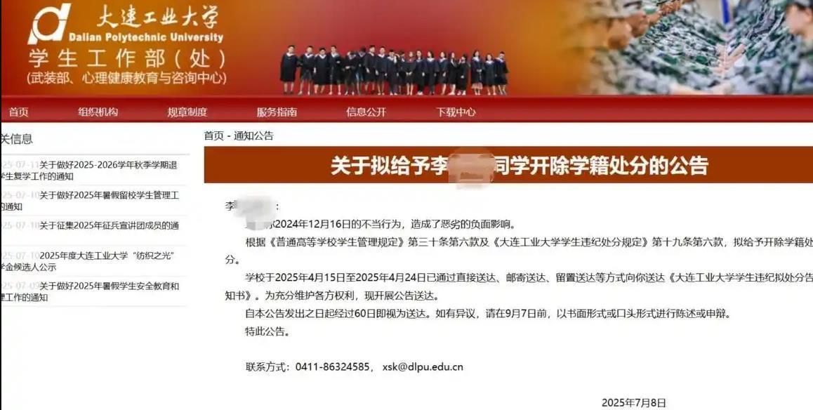 據此前報道,2024年12月,完美世界CS2上海特級錦標賽期間,烏克蘭選手Zeus在粉絲群發布其與一名中國女子的親密視頻,引發輿論關注。事件發酵后,大連工業大學學生李某某被指為事件的女主角。7月8日,大連工業大學發布公告稱,擬對其作出開除學籍處分。