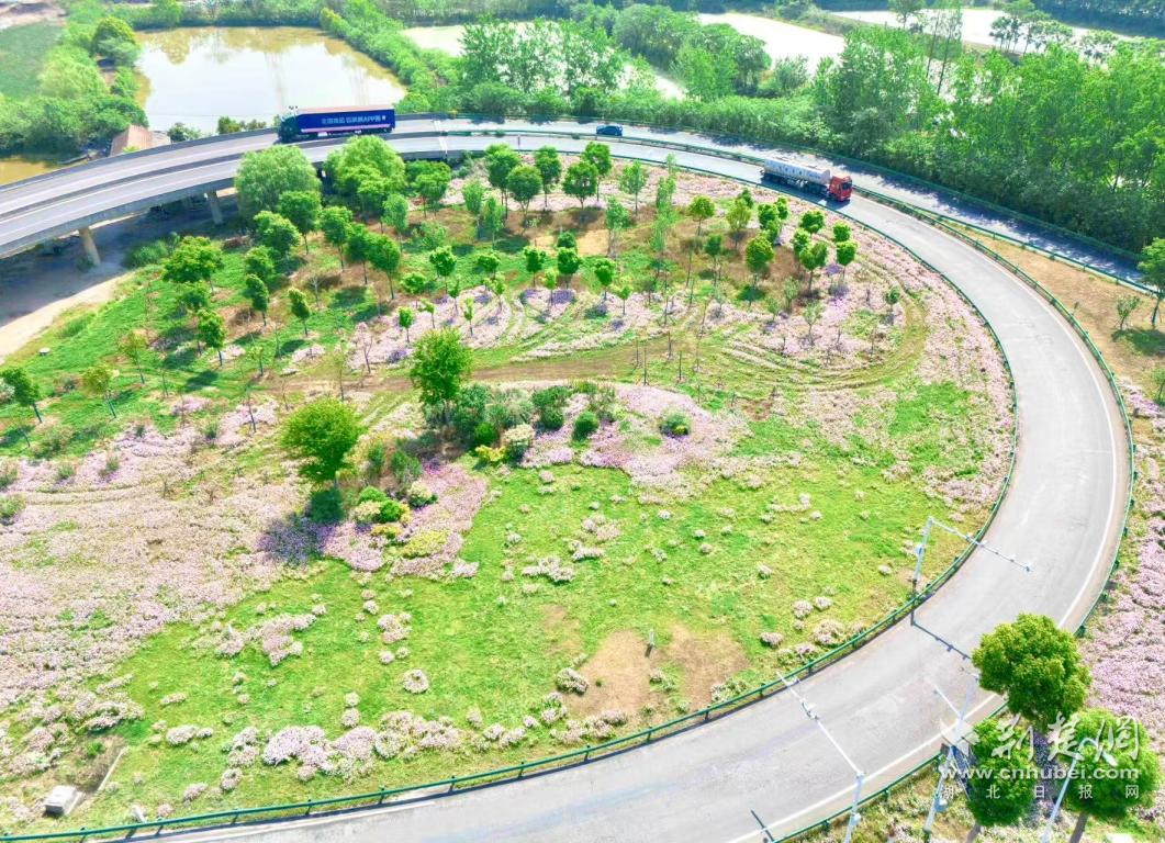 花海是奪目的焦點,而綠色是永恒的基底。整治工程不僅著眼于當季花卉,更注重長效生態景觀的構建。與此同時,在今年5月份,從武荊高速匝道盤旋而下進入107國道沿線,另一場“花事”已然上演:20000余平方米的月見草花海迎風綻放,綿延1000余米,粉色的花浪與匝道交會處種植的夾竹桃、月季、雞爪槭等綠植交相輝映,配合綠植景觀游園的精心設計,成為武漢西大門一道亮麗的風景線。