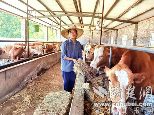 麻城鎮(zhèn)板廟村村民孫紅明正在給肉牛喂草。 李德銀 攝
