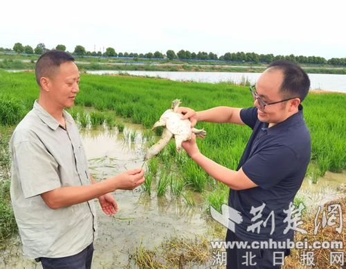 區(qū)經(jīng)管局工作人員在炎奇農(nóng)業(yè)的稻香甲魚養(yǎng)殖基地,察看甲魚長勢。 李德銀 攝