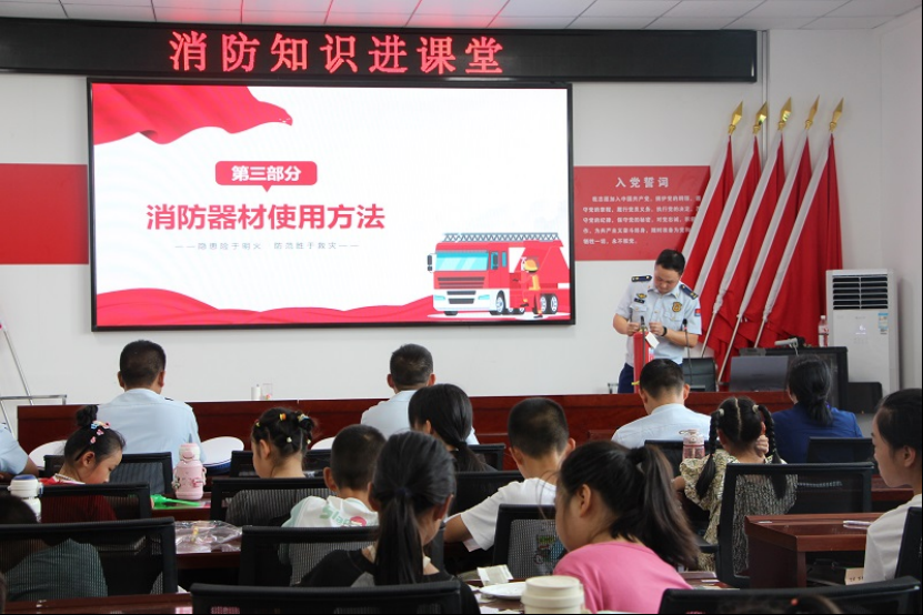 活動最后,大隊黨員為村里的小朋友們送上了一堂別開生面的消防知識宣講課。課堂上,通過視頻講解、互動問答等形式,宣傳員用通俗易懂的語言普及消防安全常識,現場演示滅火器使用方法時,一句“小朋友們,知道滅火器怎么用嗎?”瞬間點燃孩子們的參與熱情,在輕松互動中播下安全種子。