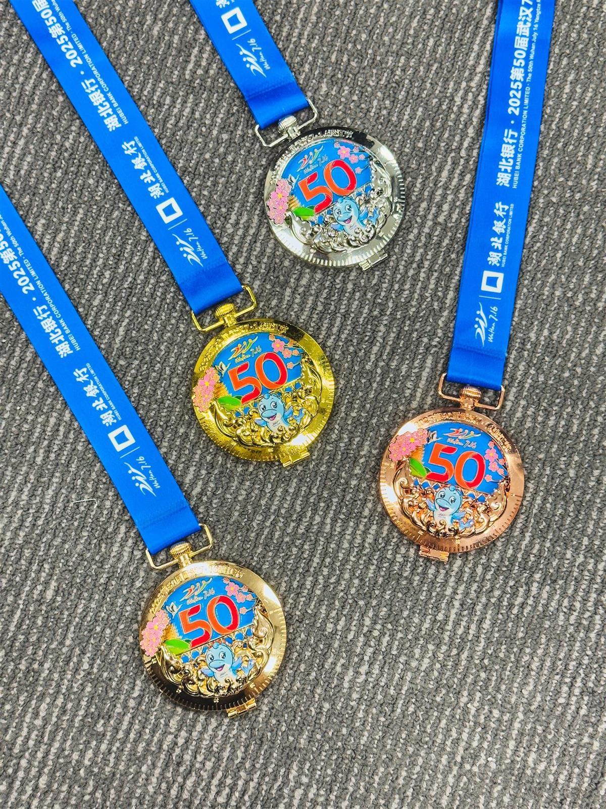 據介紹,今年恰逢第五十屆渡江節,賽事獎牌設計以“時間”為核心,采用獨特懷表結構設計,與往屆相比更具紀念意義與層次感。外層鏤空江水搭配時間刻度,呼應50年歷程;內層以50周年字體為主,融入武漢地標、黃鶴與櫻花,展現城市風情。